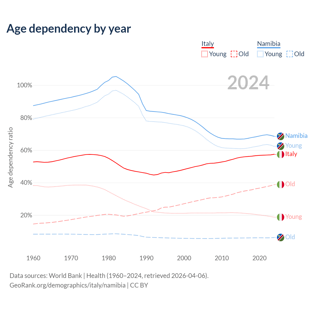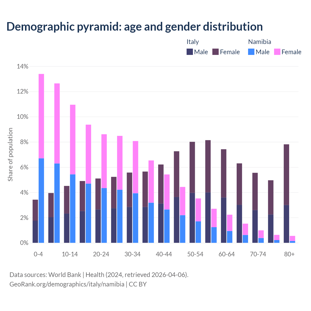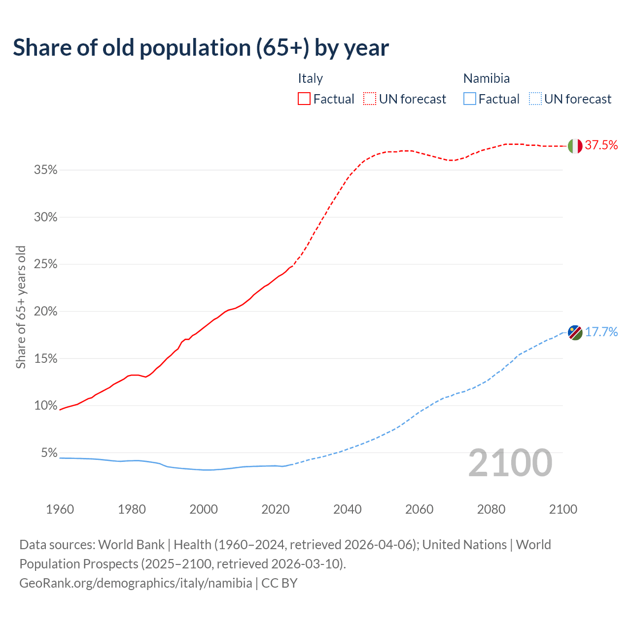 The share of older people aged 65 and over is 24.6% in Italy and 3.67% in Namibia. Life expectancy in Italy compared to Namibia .