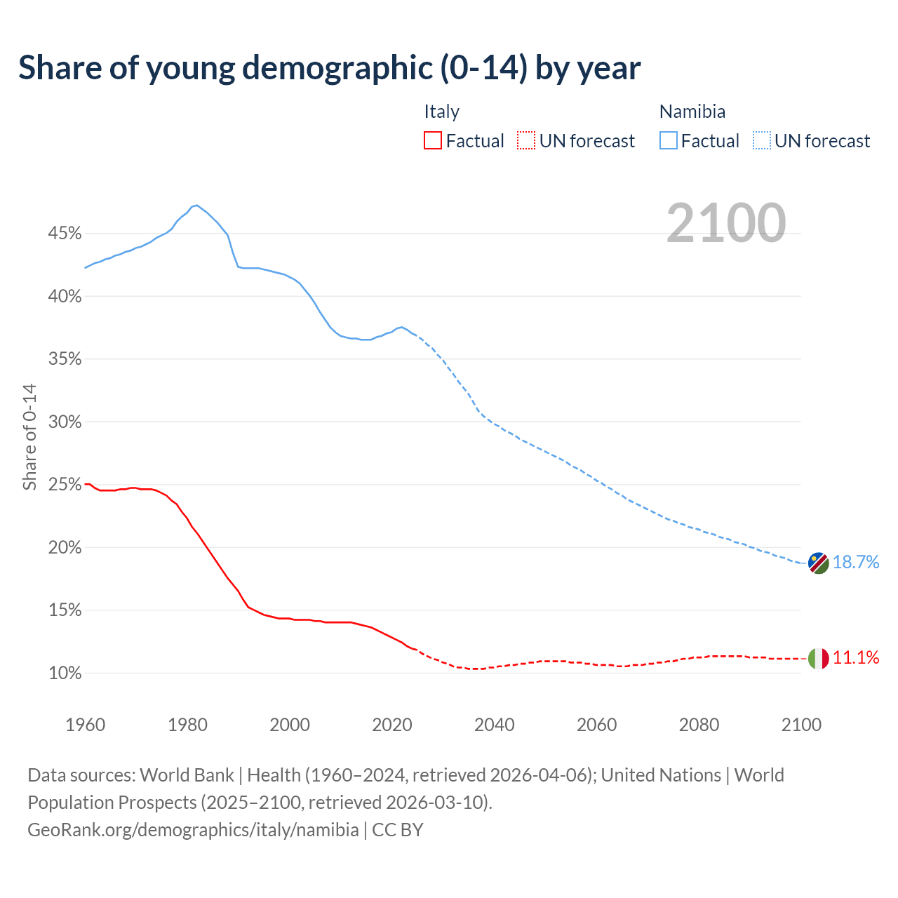 - As of 2026, the population of Italy is 58.6M vs 3.17M in Namibia - 18.5 times difference.