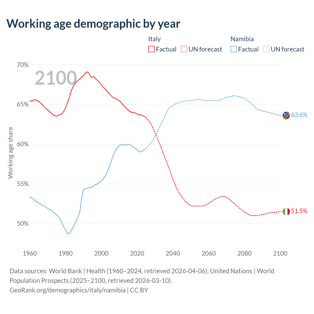 - Italy has 37.2M working age adults (aged 15-64) vs 1.88M in Namibia.
