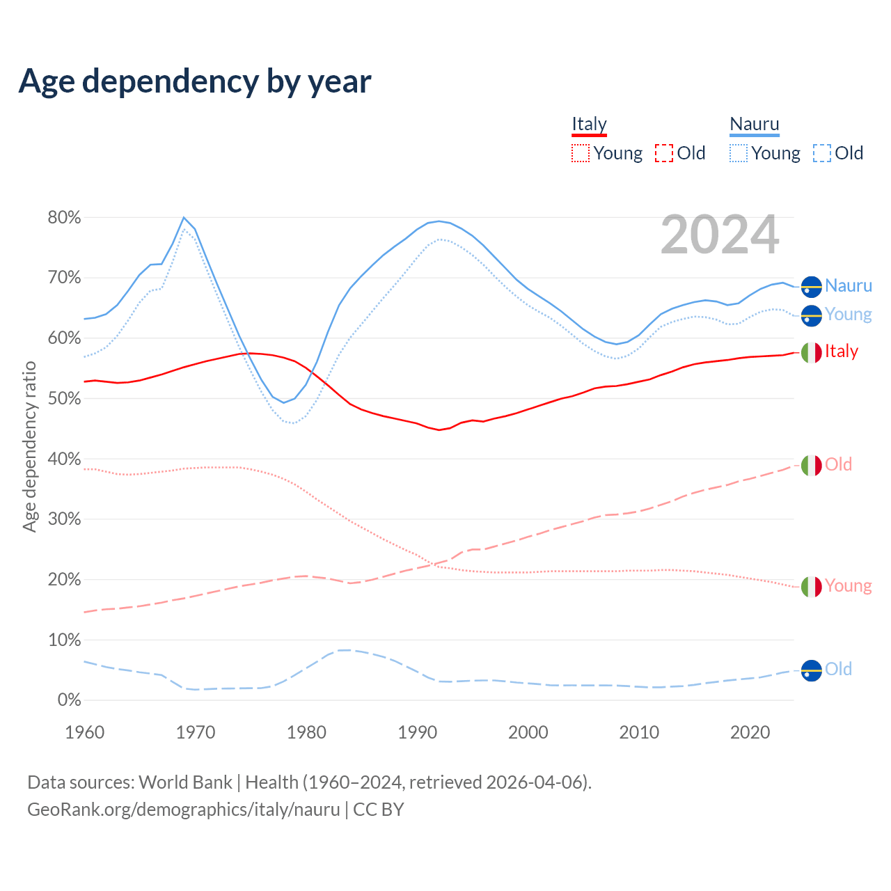 - Italy is ranked 4/196 by median age (oldest to youngest) vs 155/196 for Nauru.