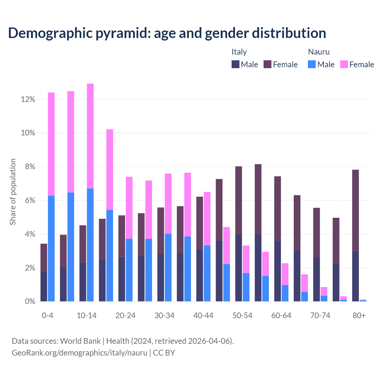- As of 2026, the population of Italy is 58.6M vs 12.1K in Nauru - 4,830 times difference.