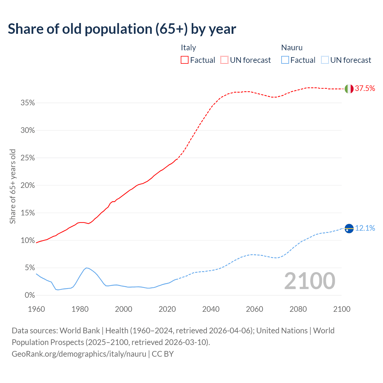 The share of older people aged 65 and over is 24.6% in Italy and 2.85% in Nauru. Life expectancy in Italy compared to Nauru .