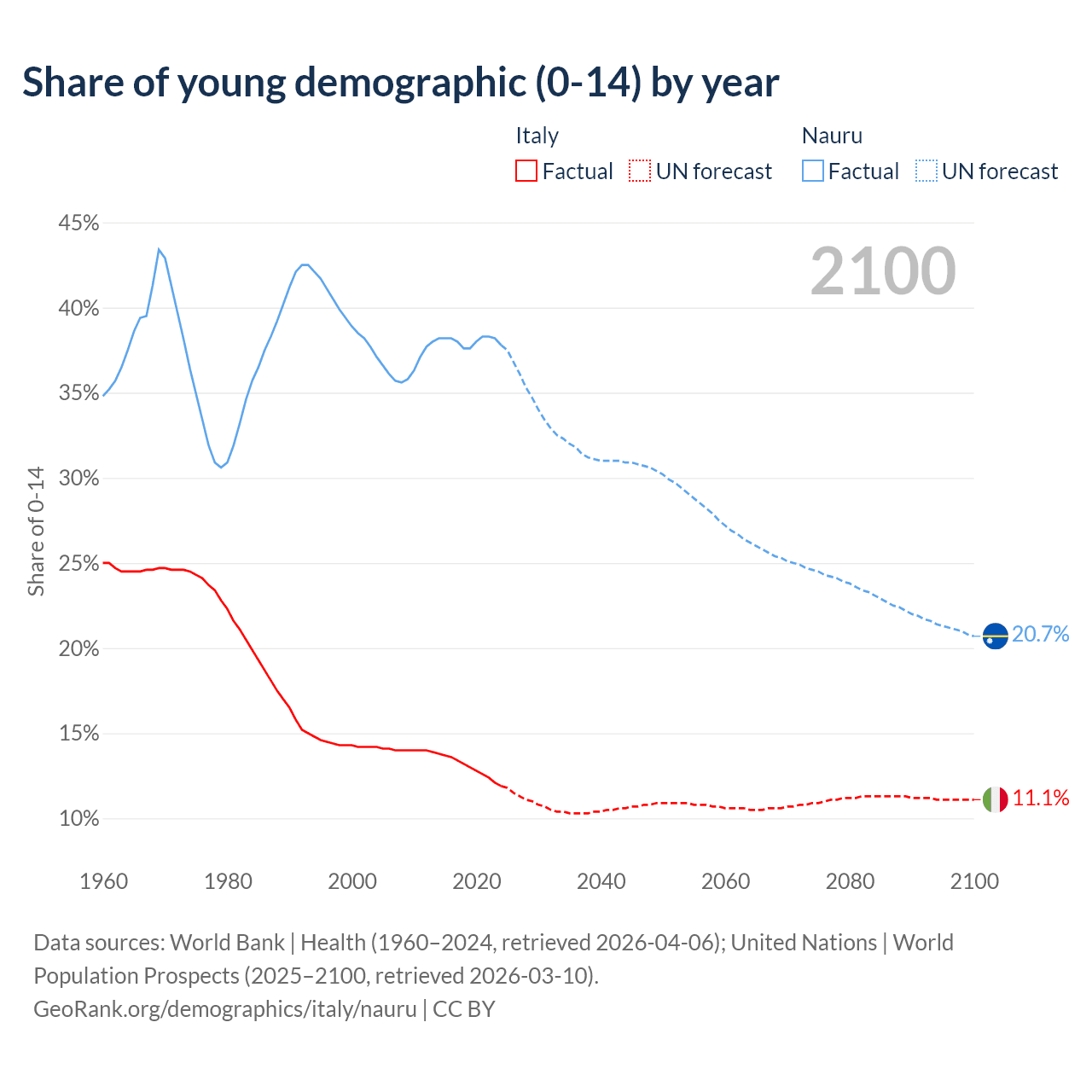 - The share of young demographic (0-15 years old) in Italy is 11.9% vs 37.8% in Nauru.