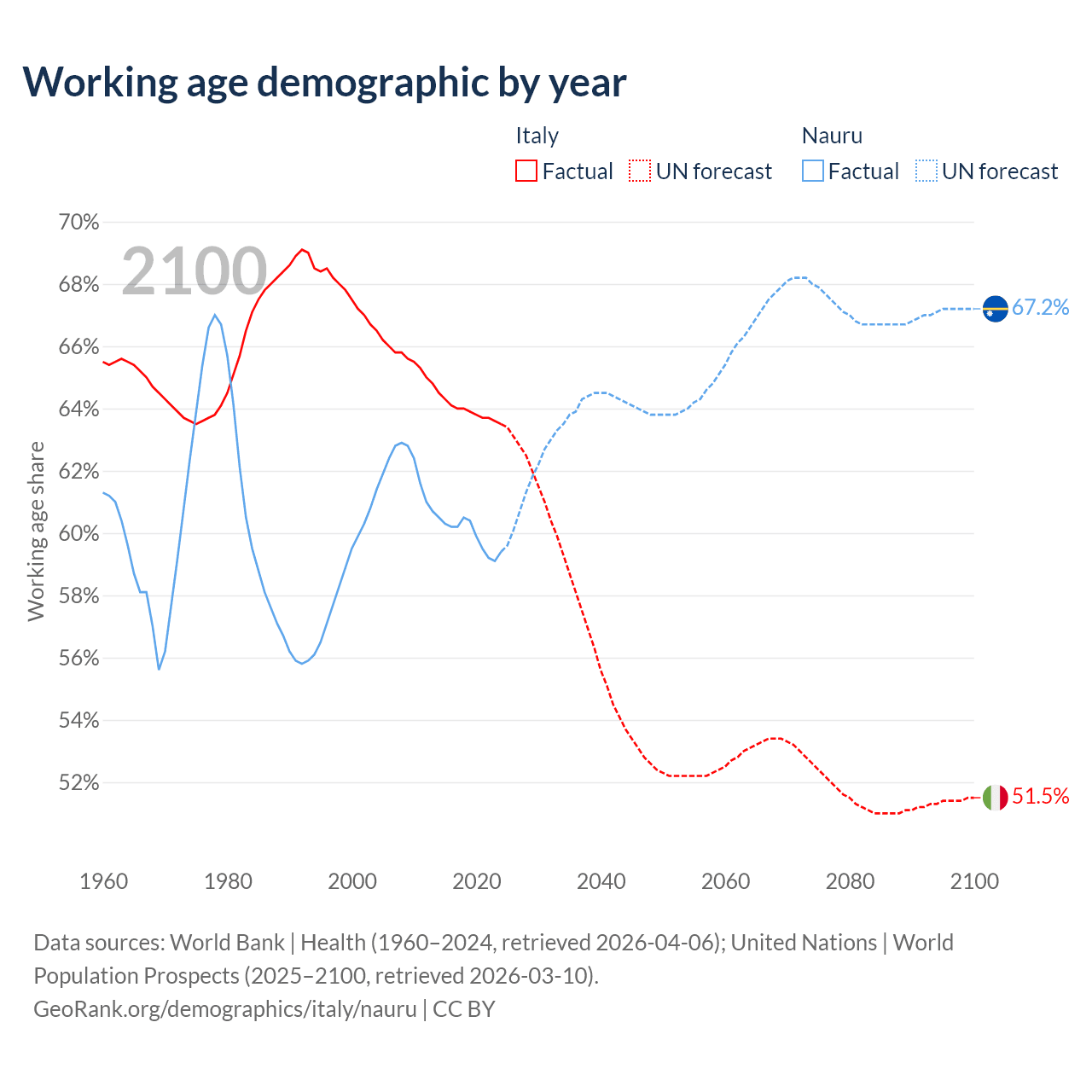 - Italy has 37.2M working age adults (aged 15-64) vs 7.2K in Nauru.