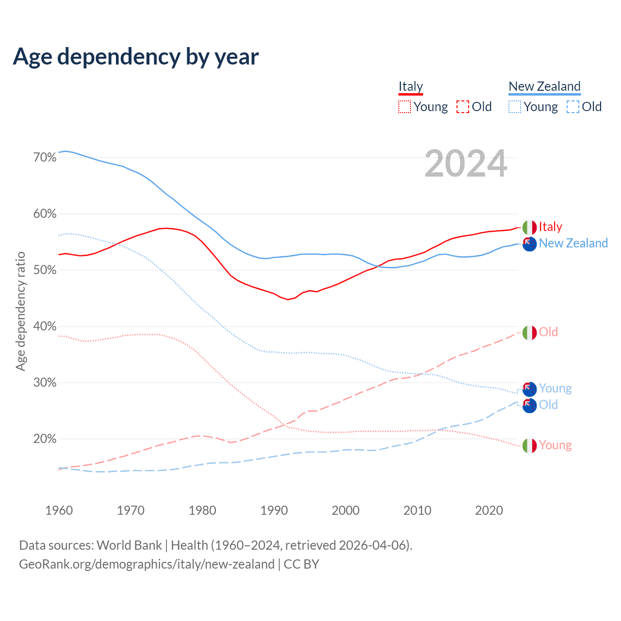 - Italy is ranked 4/196 by median age (oldest to youngest) vs 56/196 for New Zealand.