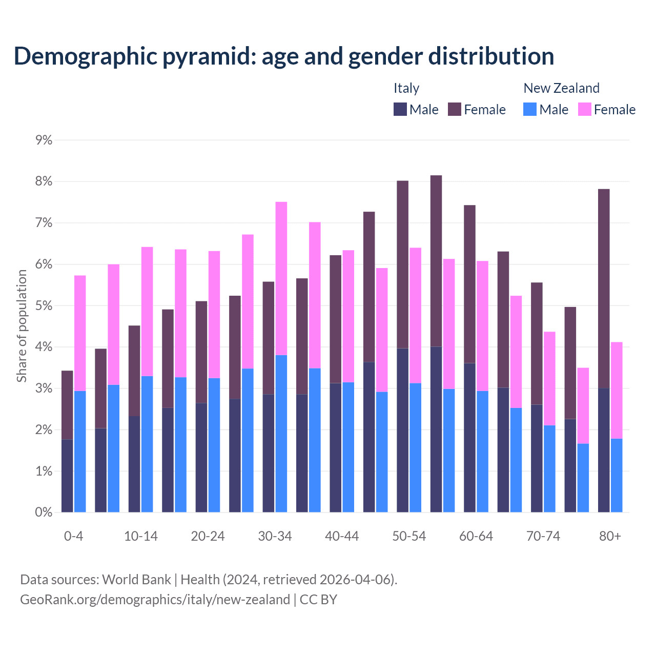 The share of older people aged 65 and over is 24.6% in Italy and 17.2% in New Zealand. Life expectancy in Italy compared to New Zealand .
