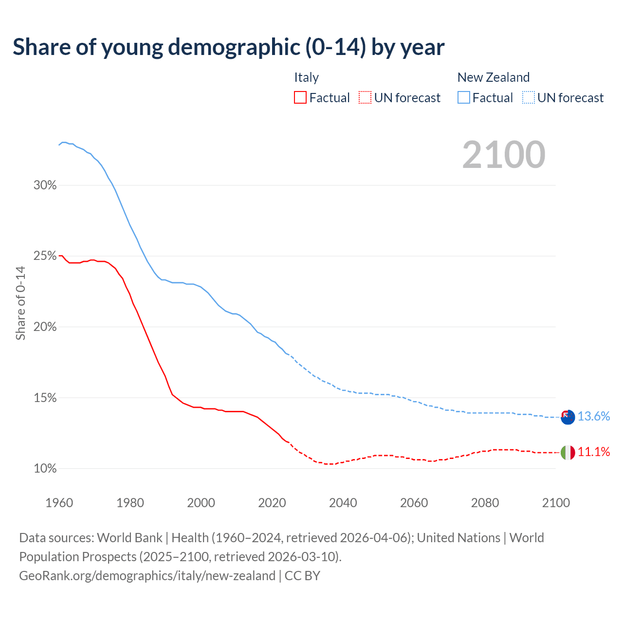 - The share of young demographic (0-15 years old) in Italy is 11.9% vs 18.1% in New Zealand.