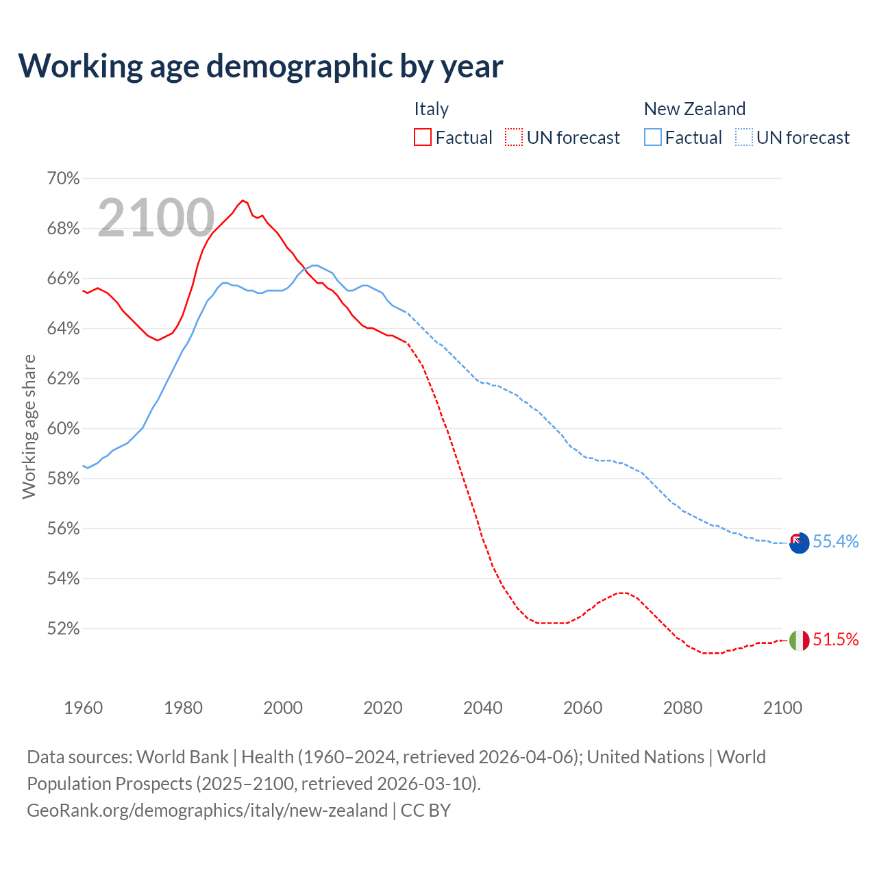 Median age Italy vs New Zealand, 1960-2100