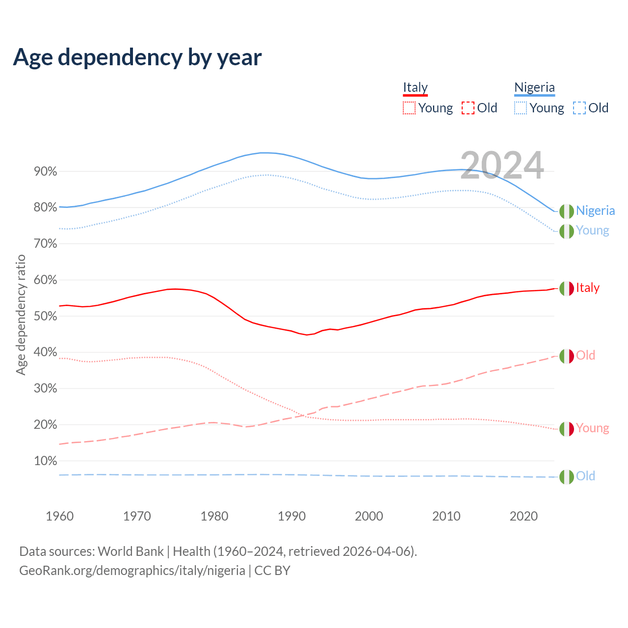 - Italy is ranked 4/196 by median age (oldest to youngest) vs 178/196 for Nigeria.