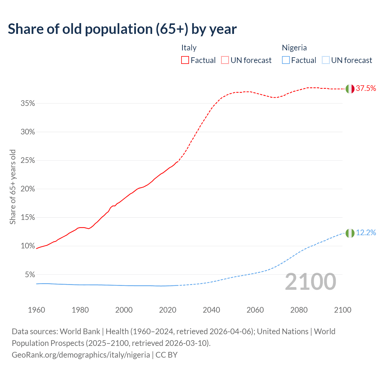 The share of older people aged 65 and over is 24.6% in Italy and 3.05% in Nigeria. Life expectancy in Italy compared to Nigeria .