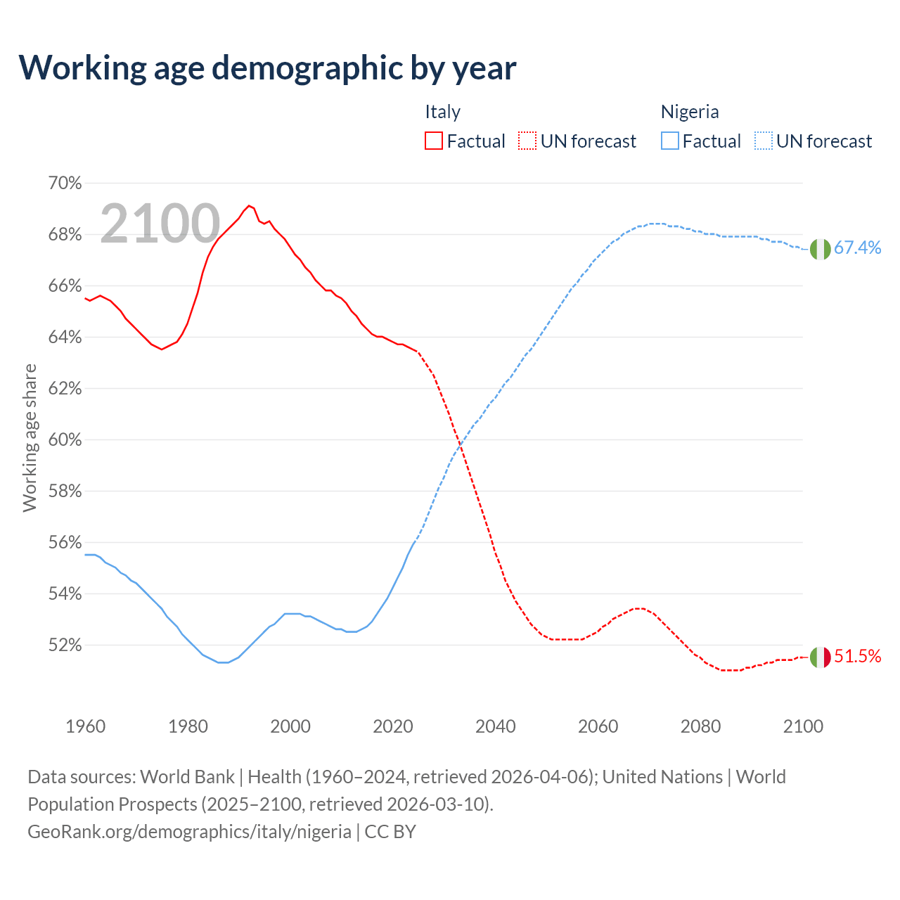 Median age Italy vs Nigeria, 1960-2100