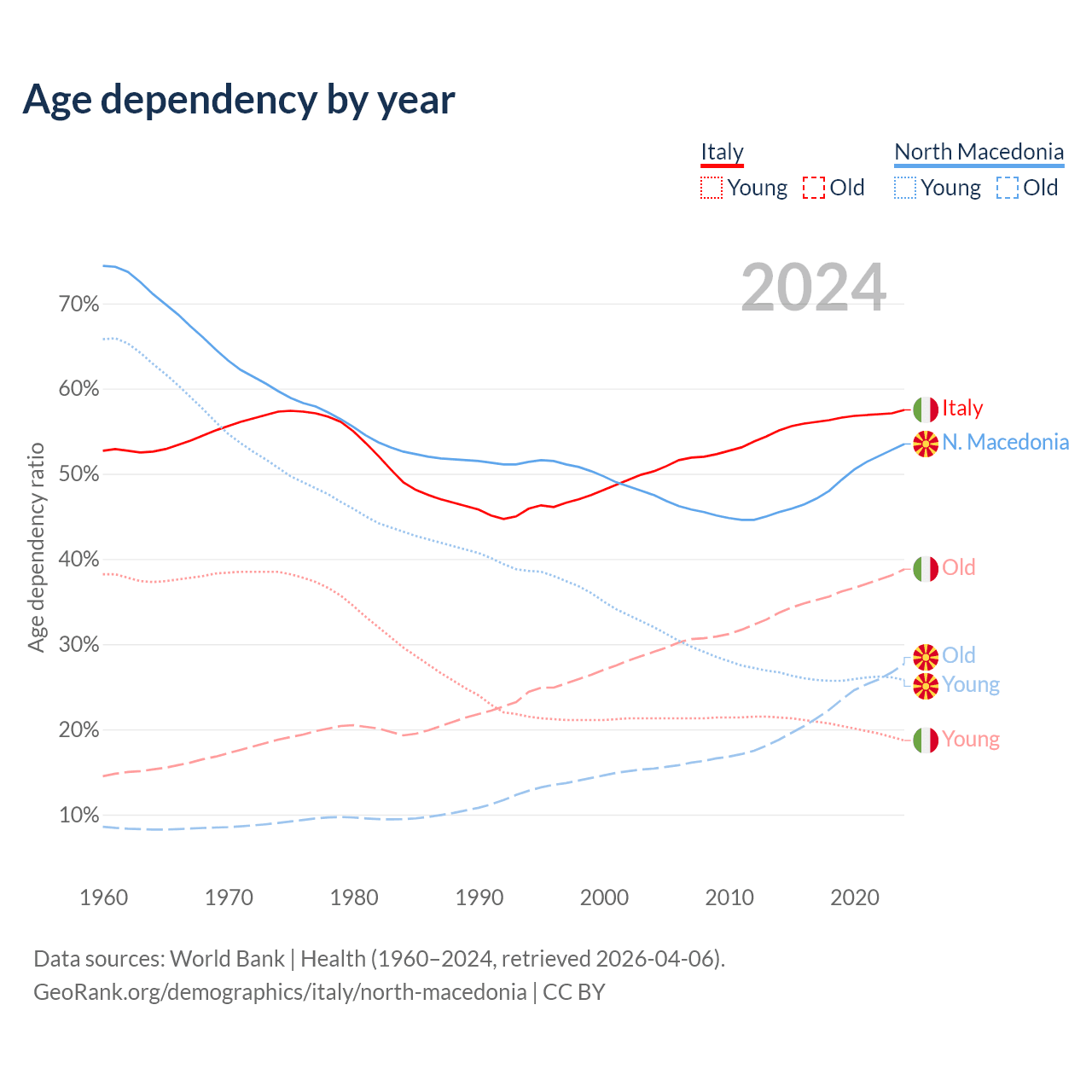 - Italy is ranked 4/196 by median age (oldest to youngest) vs 37/196 for North Macedonia.