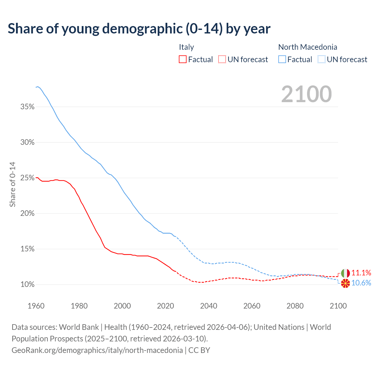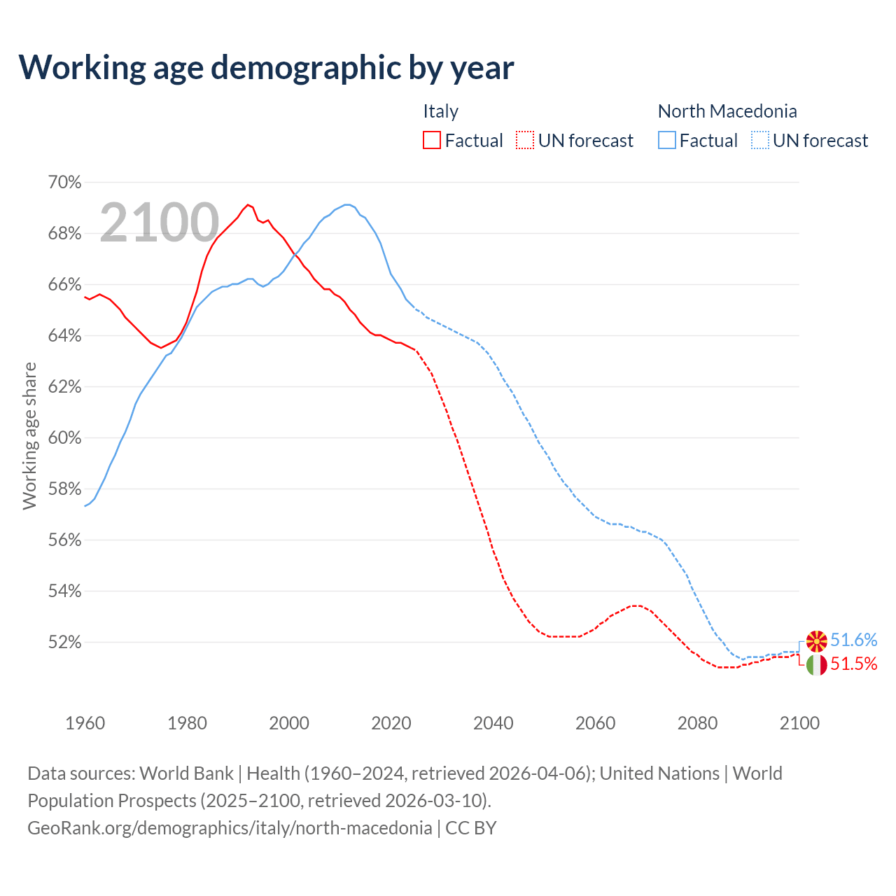 Median age Italy vs North Macedonia, 1960-2100
