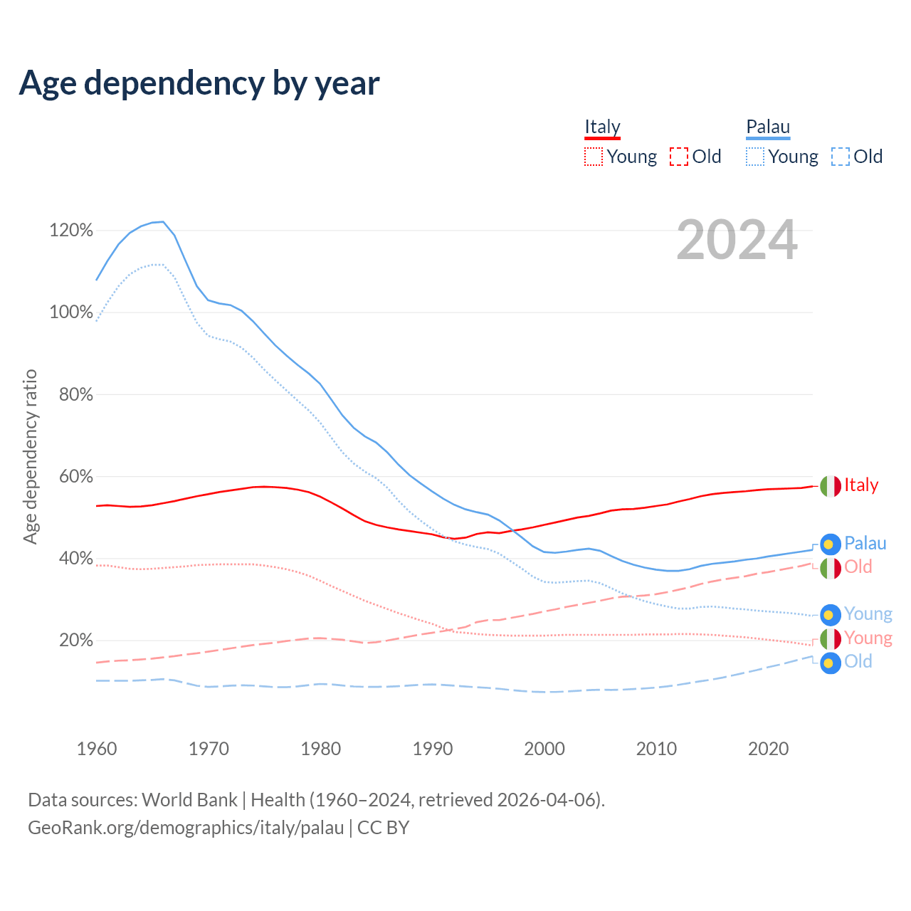 - Italy is ranked 4/196 by median age (oldest to youngest) vs 53/196 for Palau.