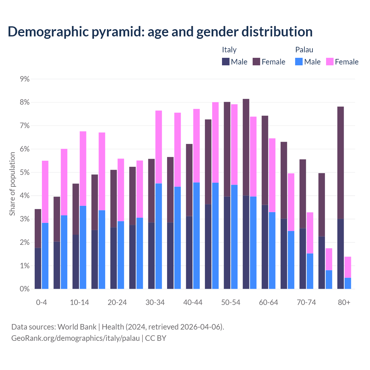 - As of 2026, the population of Italy is 58.6M vs 17.6K in Palau - 3,322 times difference.