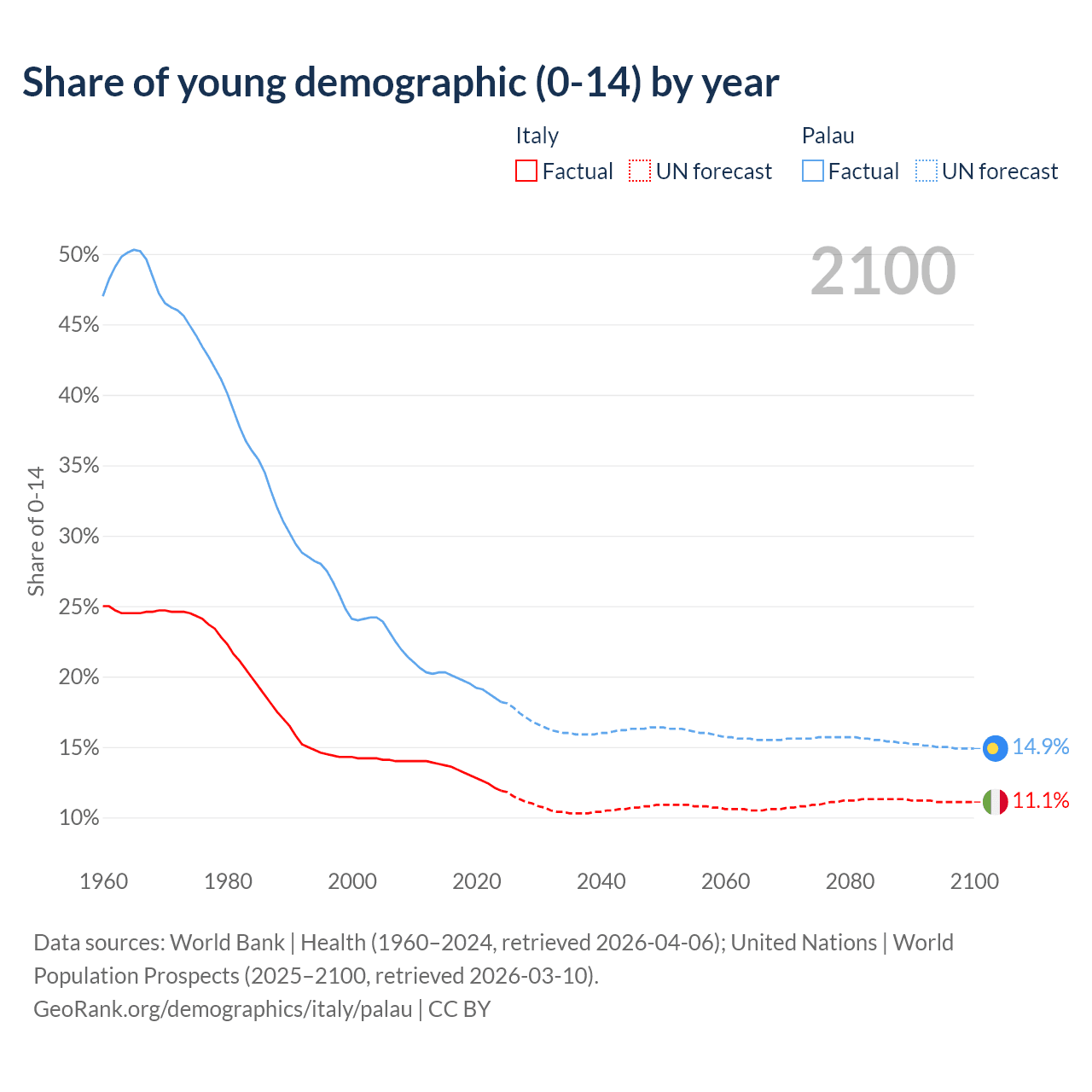 - The share of young demographic (0-15 years old) in Italy is 11.9% vs 18.2% in Palau.