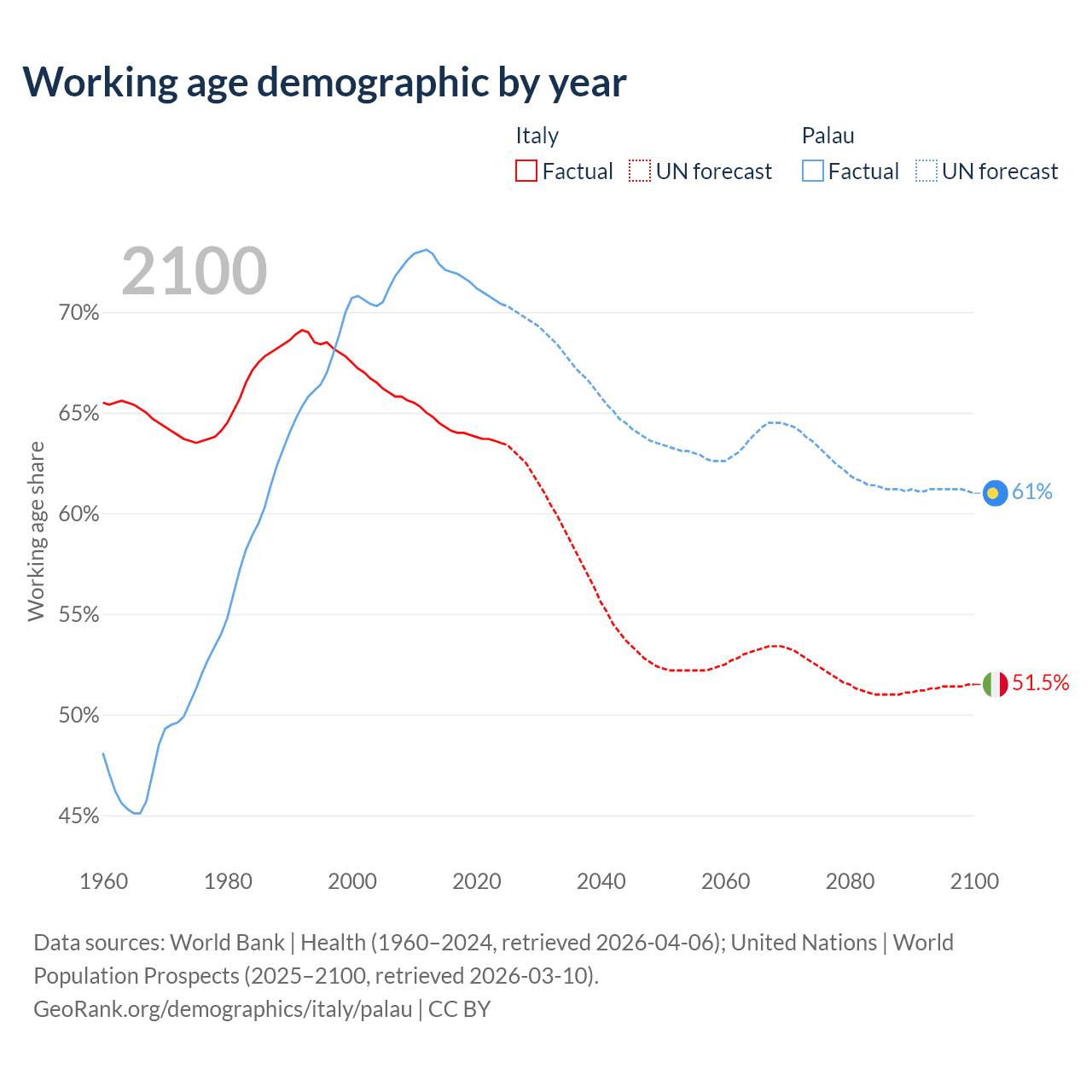 - Italy has 37.2M working age adults (aged 15-64) vs 12.4K in Palau.