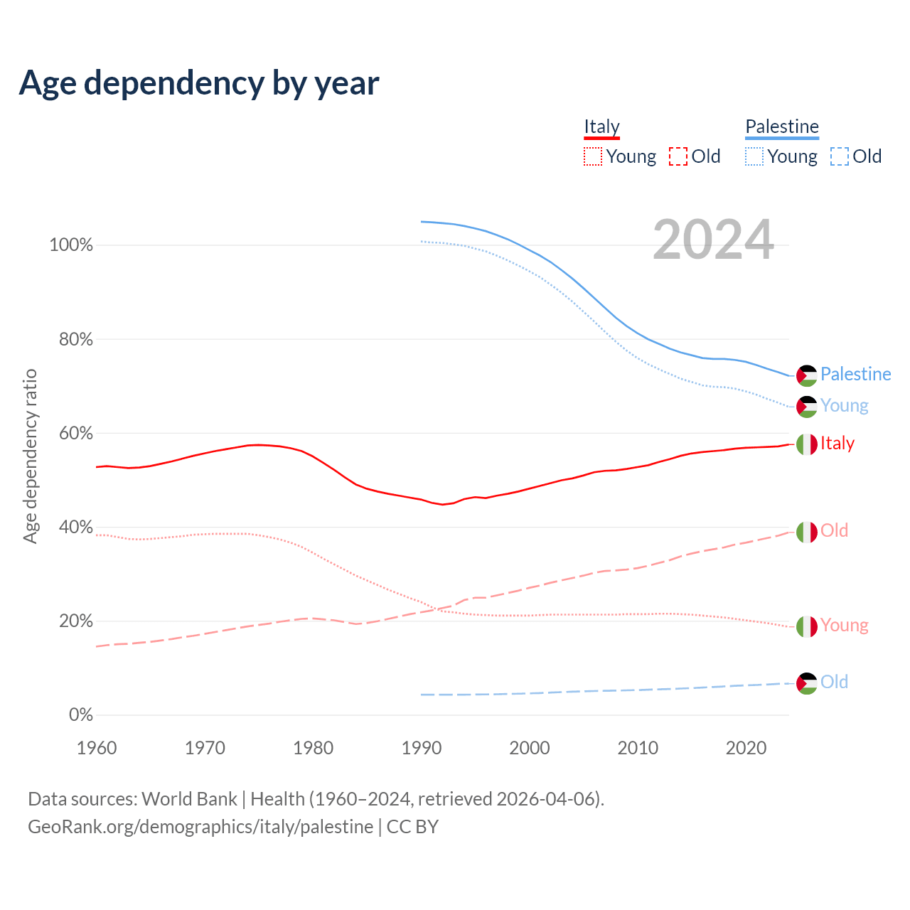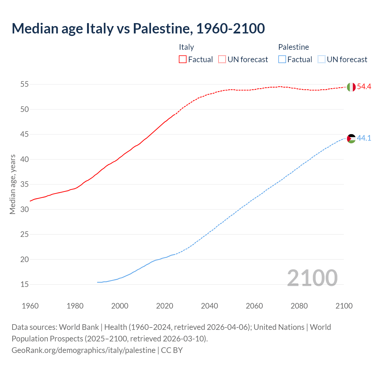 - Italy is ranked 4/196 by median age (oldest to youngest) vs 157/196 for Palestine.