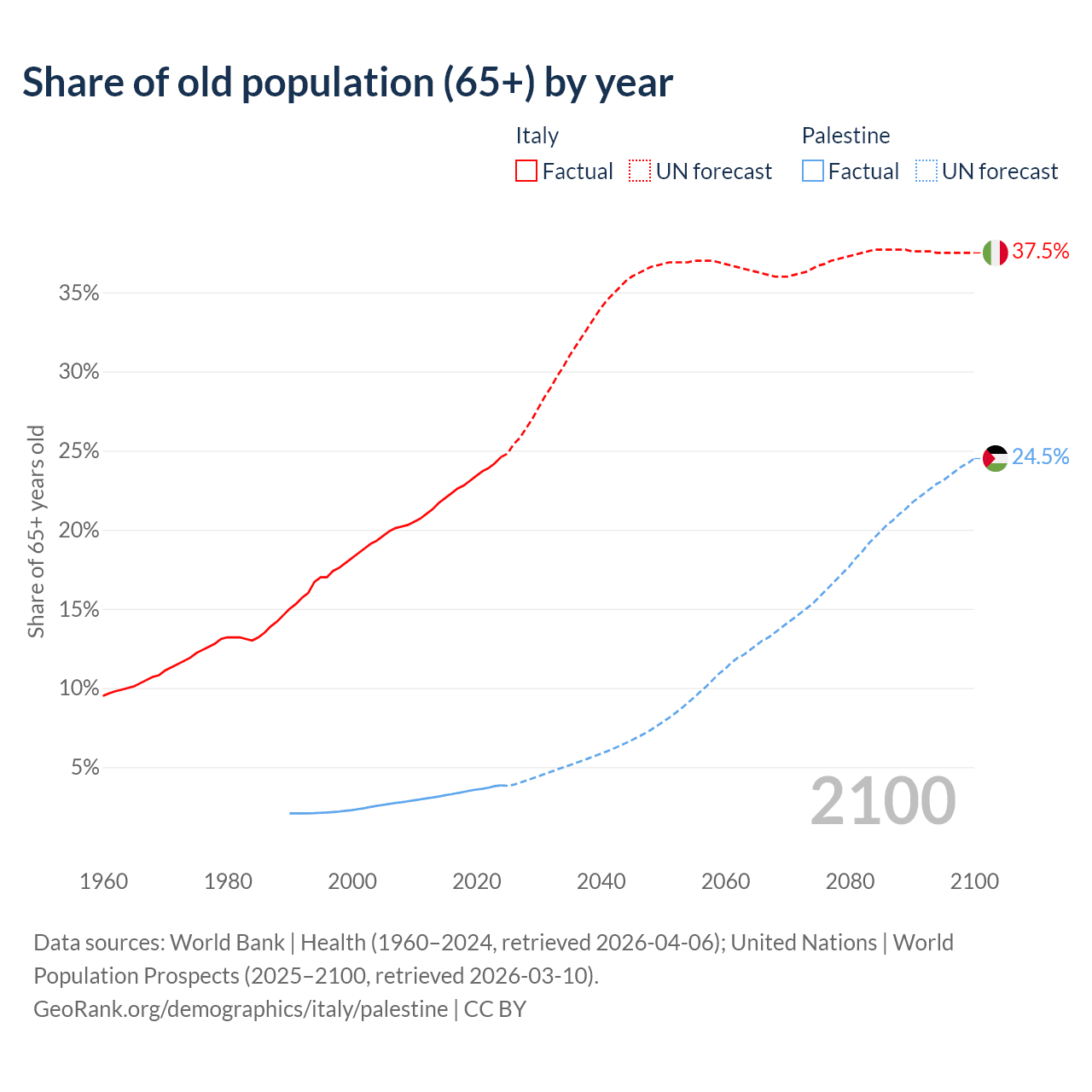 - The share of old-age demographic (65+) in Italy is 24.6% vs 3.84% in Palestine.