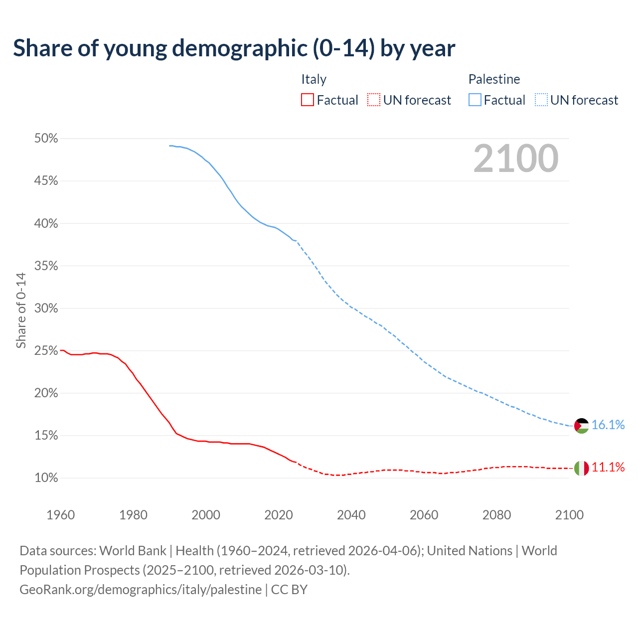 - The share of young demographic (0-15 years old) in Italy is 11.9% vs 38% in Palestine.