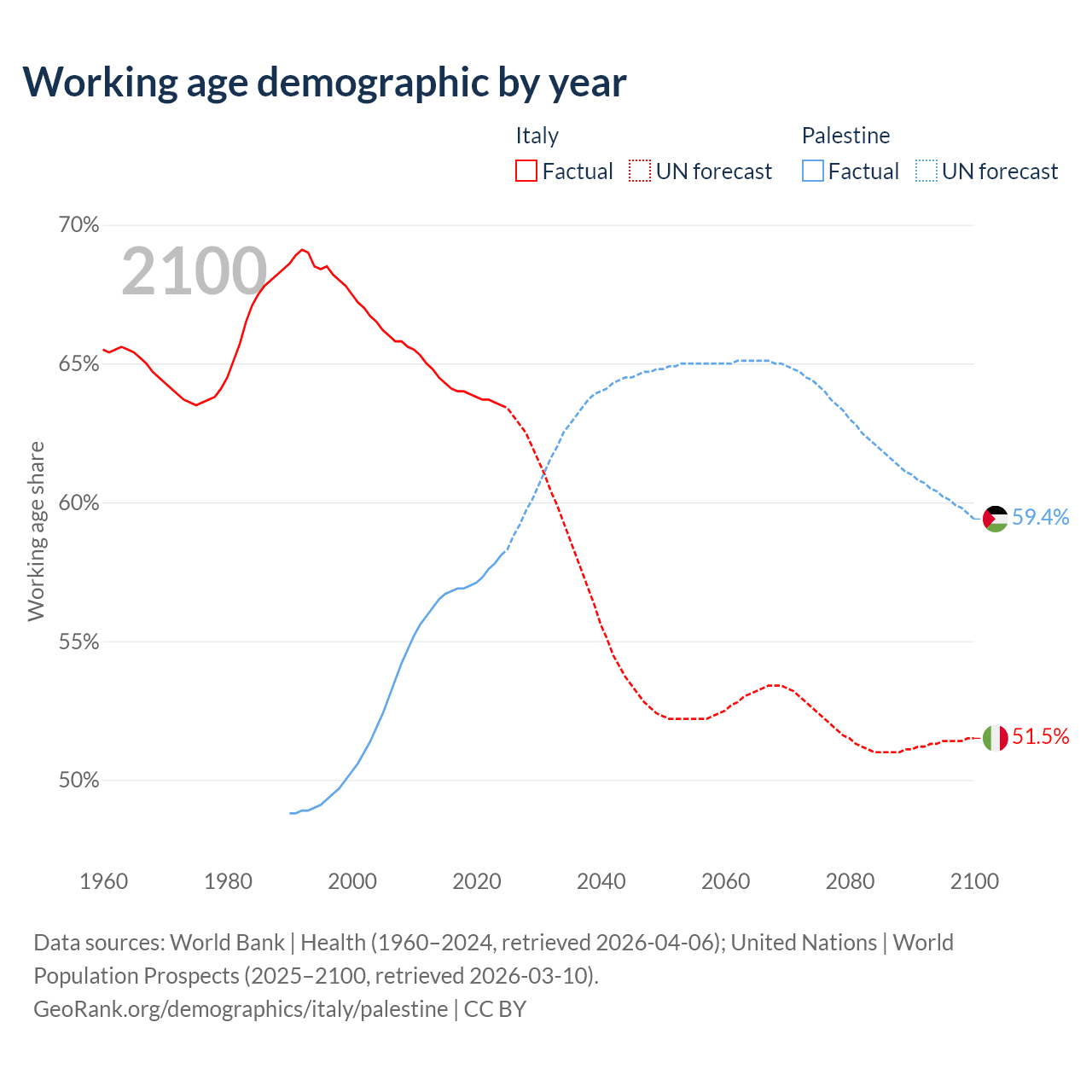 - Italy has 37.2M working age adults (aged 15-64) vs 3.2M in Palestine.