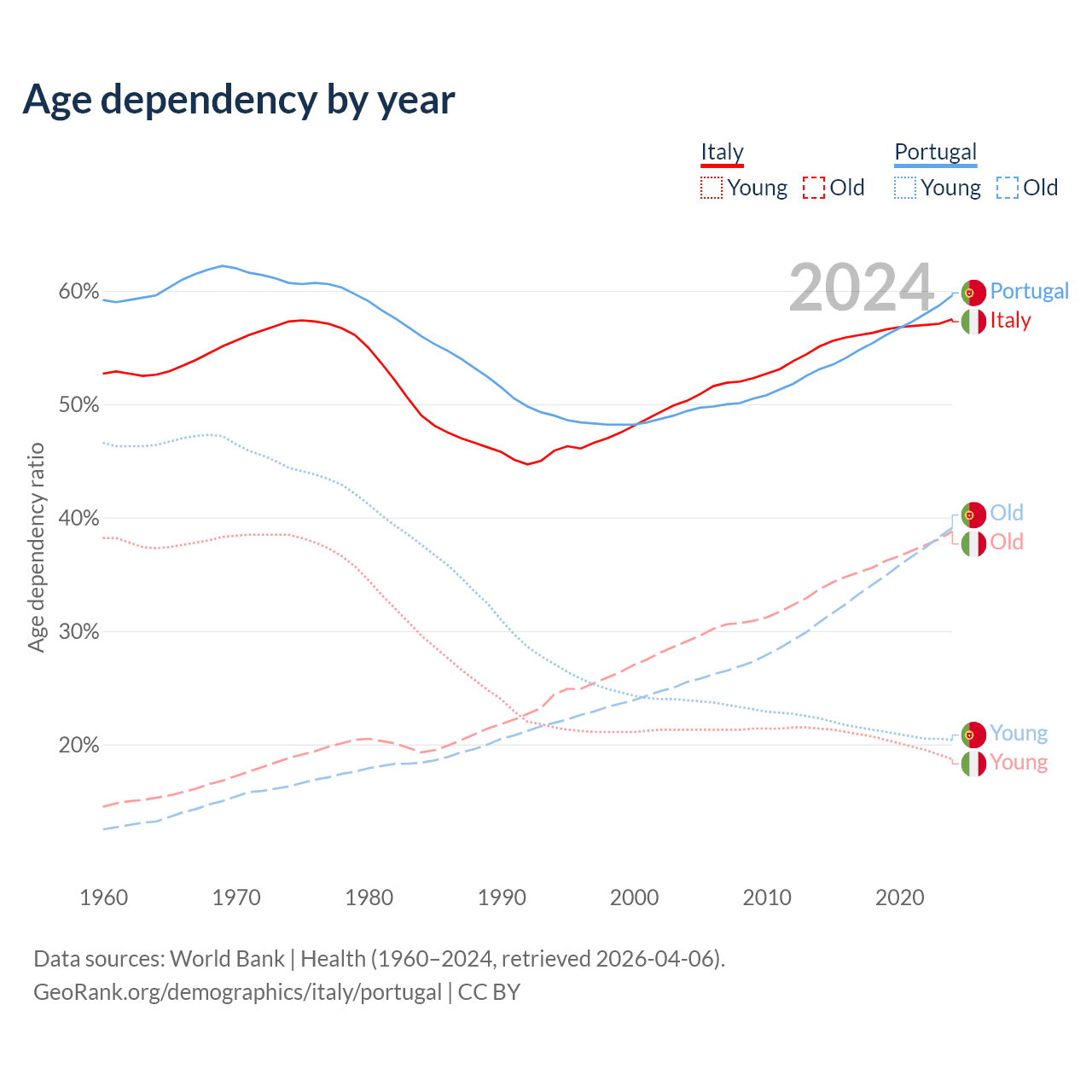 - Italy is ranked 4/196 by median age (oldest to youngest) vs 5/196 for Portugal.
