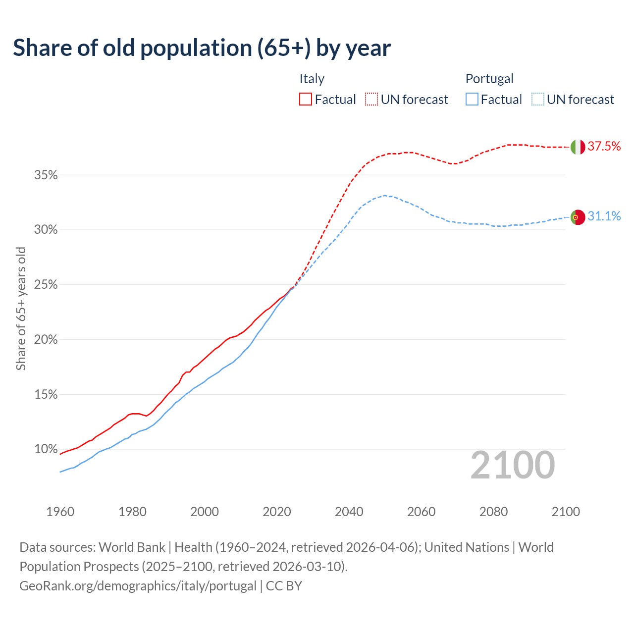 The share of older people aged 65 and over is 24.6% in Italy and 24.5% in Portugal. Life expectancy in Italy compared to Portugal .