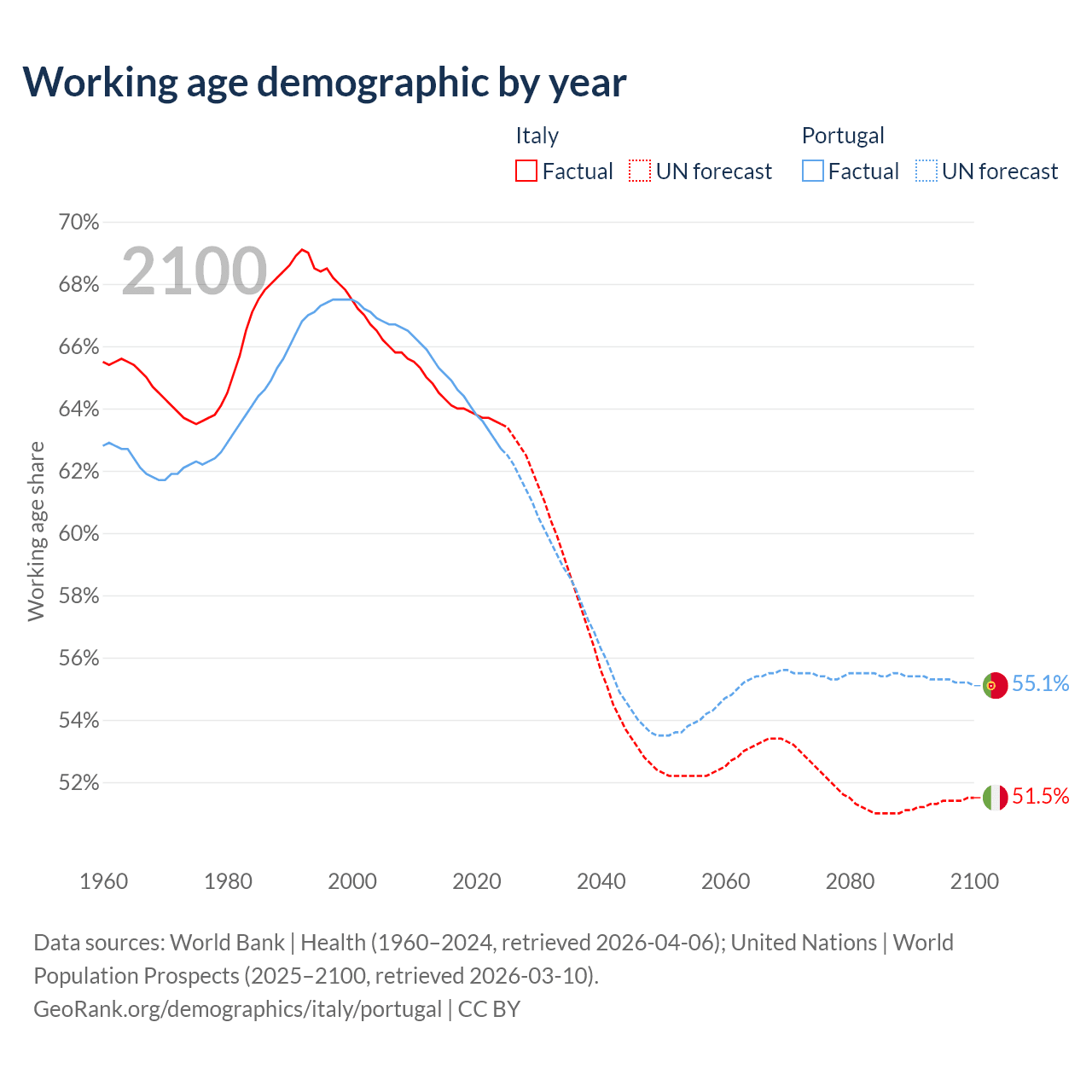 - Italy has 37.2M working age adults (aged 15-64) vs 6.68M in Portugal.