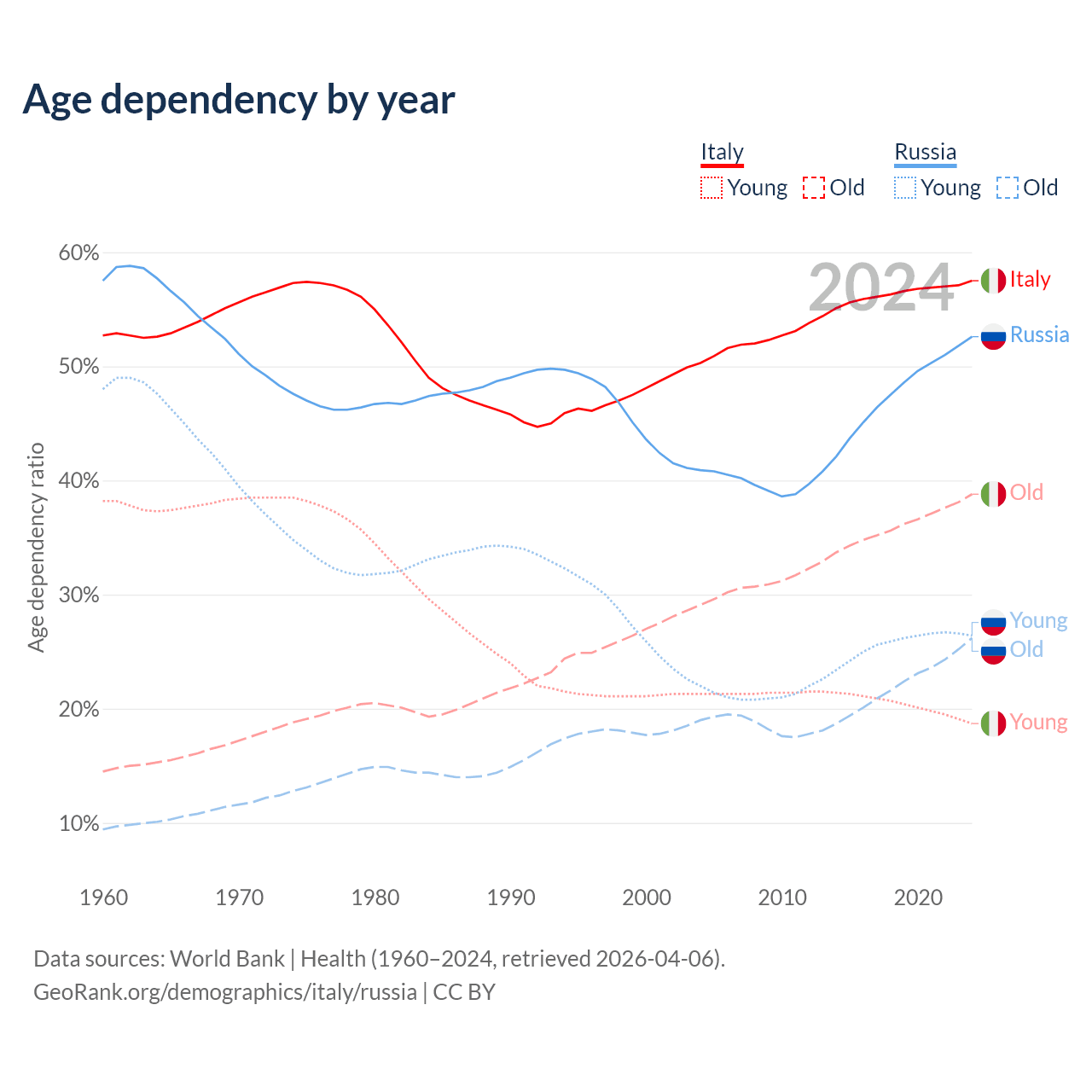 - Italy is ranked 4/196 by median age (oldest to youngest) vs 42/196 for Russia.