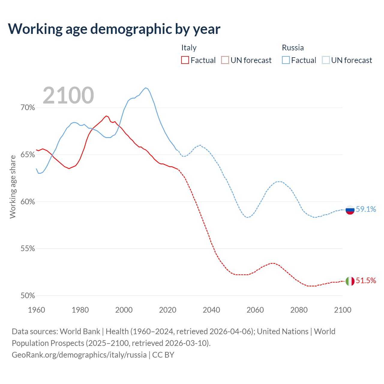 Median age Italy vs Russia, 1960-2100