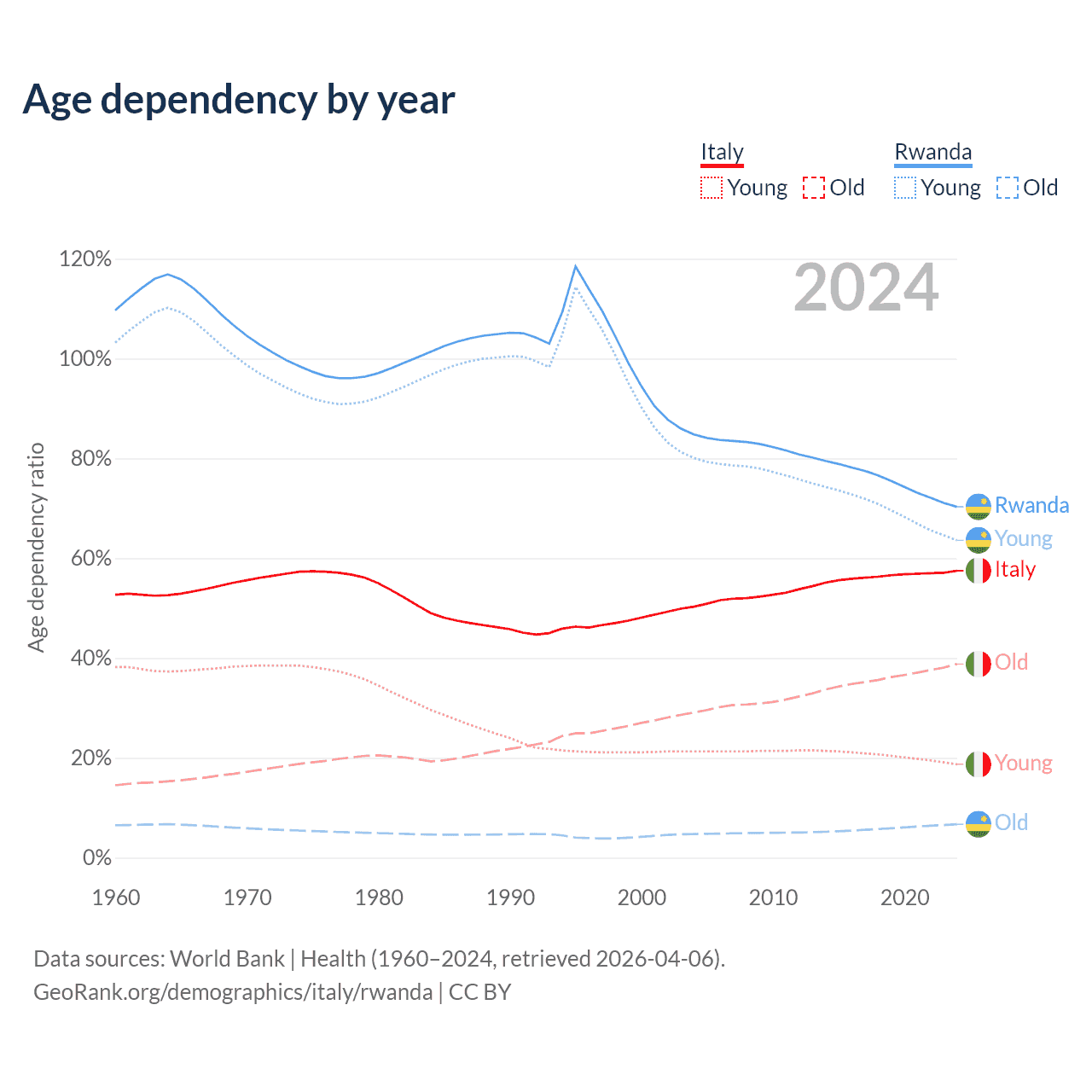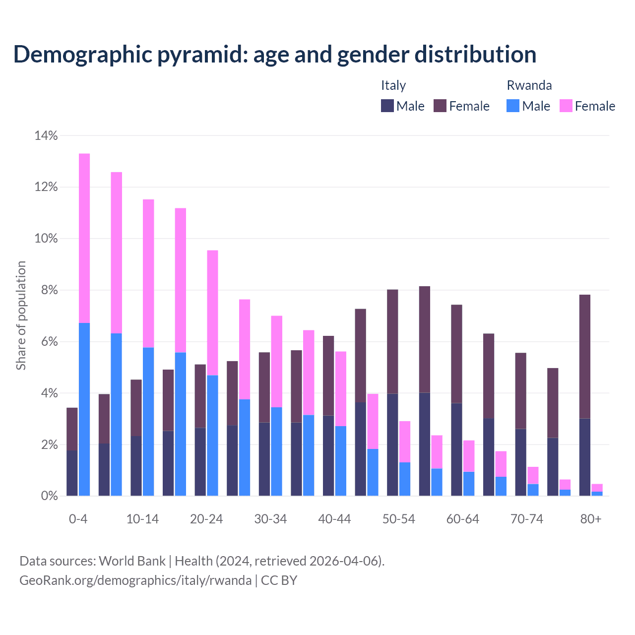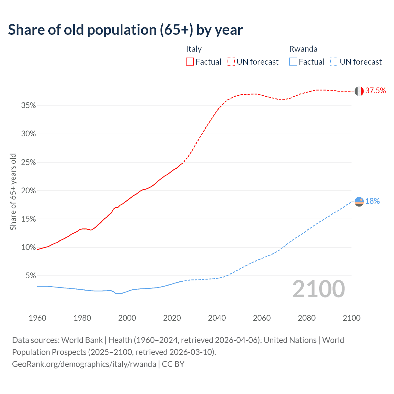 The share of older people aged 65 and over is 24.6% in Italy and 3.93% in Rwanda. Life expectancy in Italy compared to Rwanda .