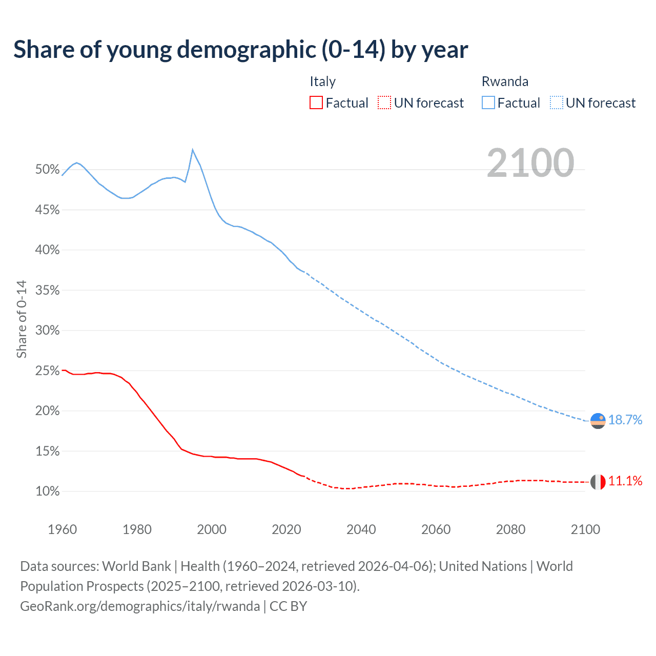 - The share of young demographic (0-15 years old) in Italy is 11.9% vs 37.4% in Rwanda.