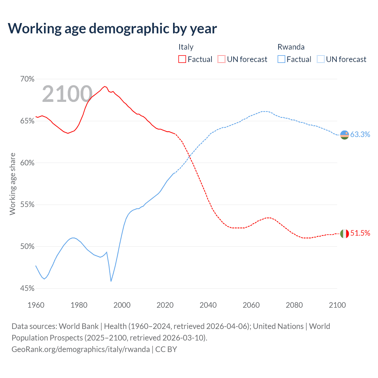 - Italy has 37.2M working age adults (aged 15-64) vs 8.79M in Rwanda.