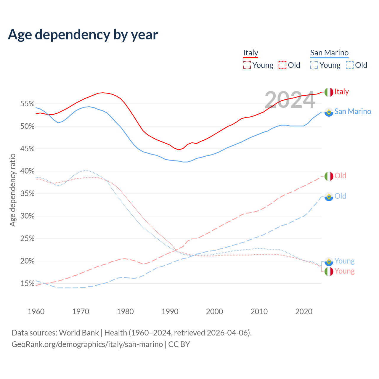 - The share of old-age demographic (65+) in Italy is 24.6% vs 22.4% in San Marino.