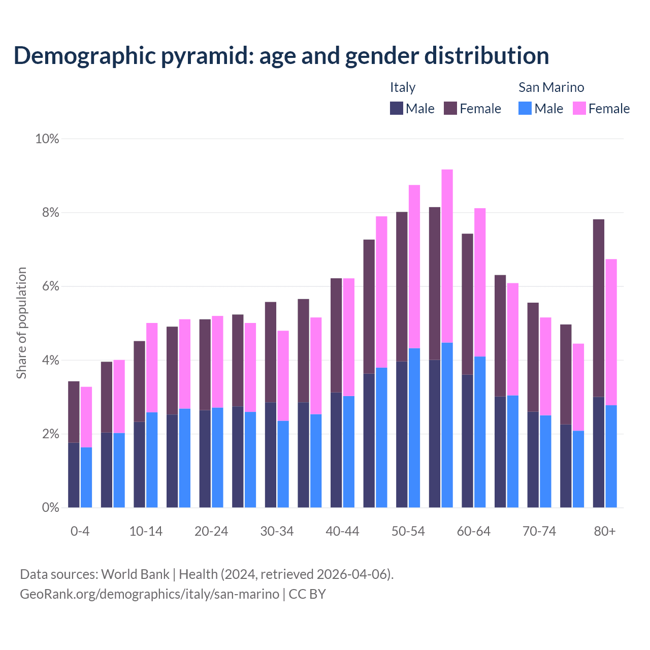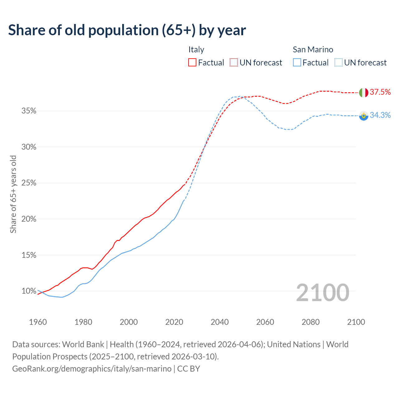 The share of older people aged 65 and over is 24.6% in Italy and 22.4% in San Marino. Life expectancy in Italy compared to San Marino .