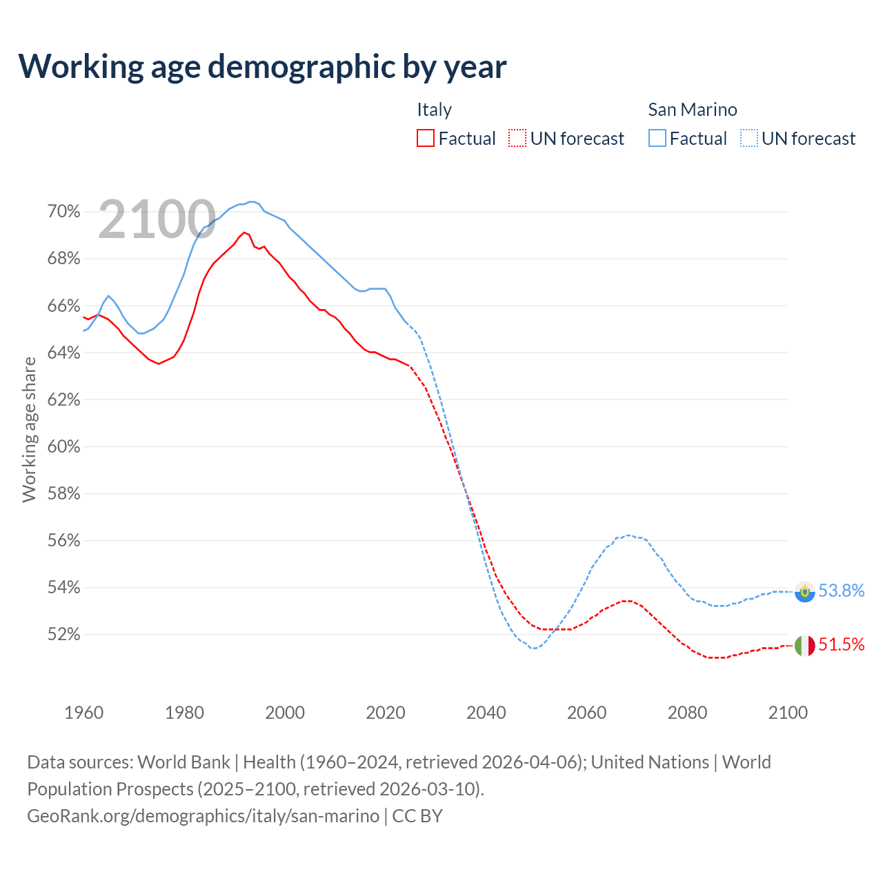 Median age Italy vs San Marino, 1960-2100