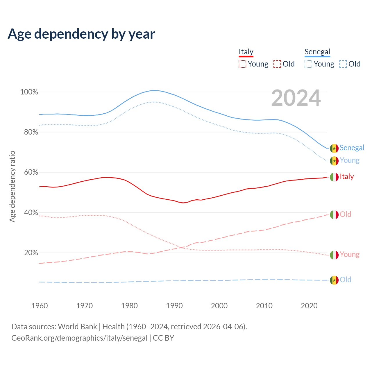 - Italy is ranked 4/196 by median age (oldest to youngest) vs 162/196 for Senegal.