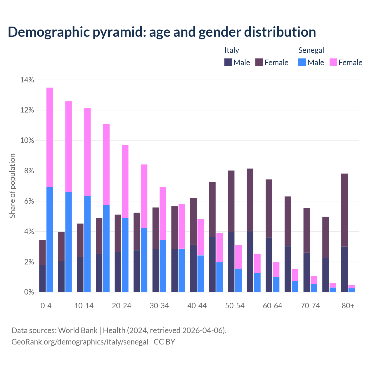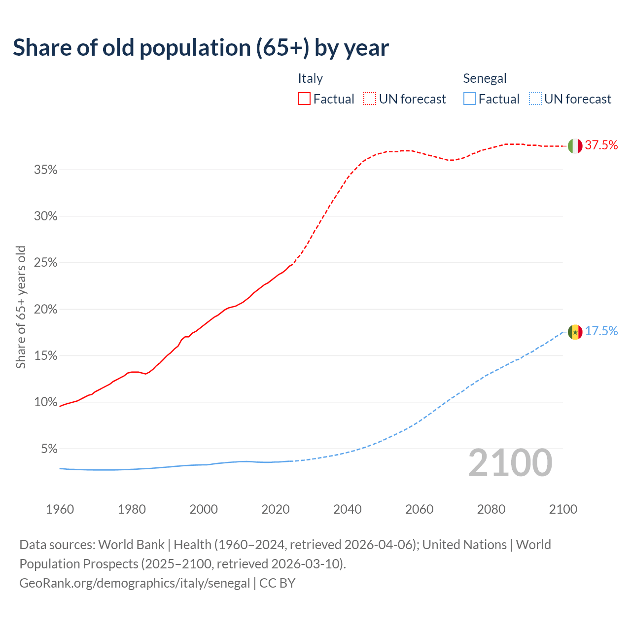 The share of older people aged 65 and over is 24.6% in Italy and 3.62% in Senegal. Life expectancy in Italy compared to Senegal .