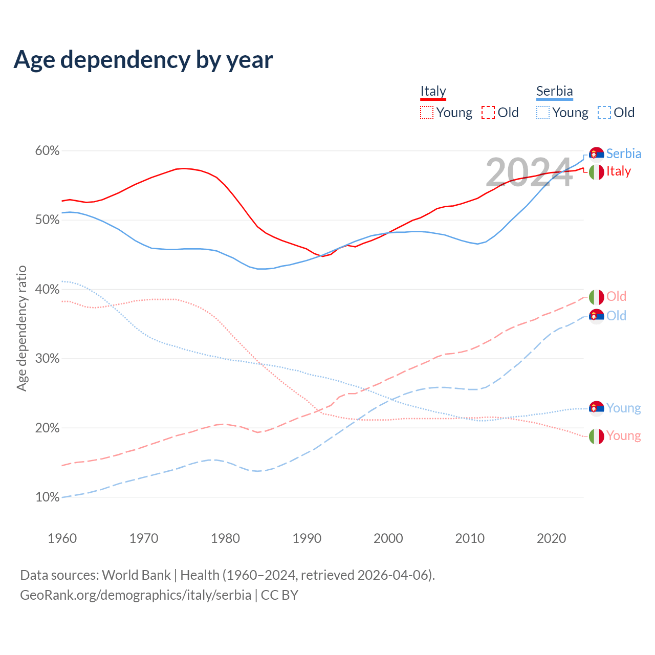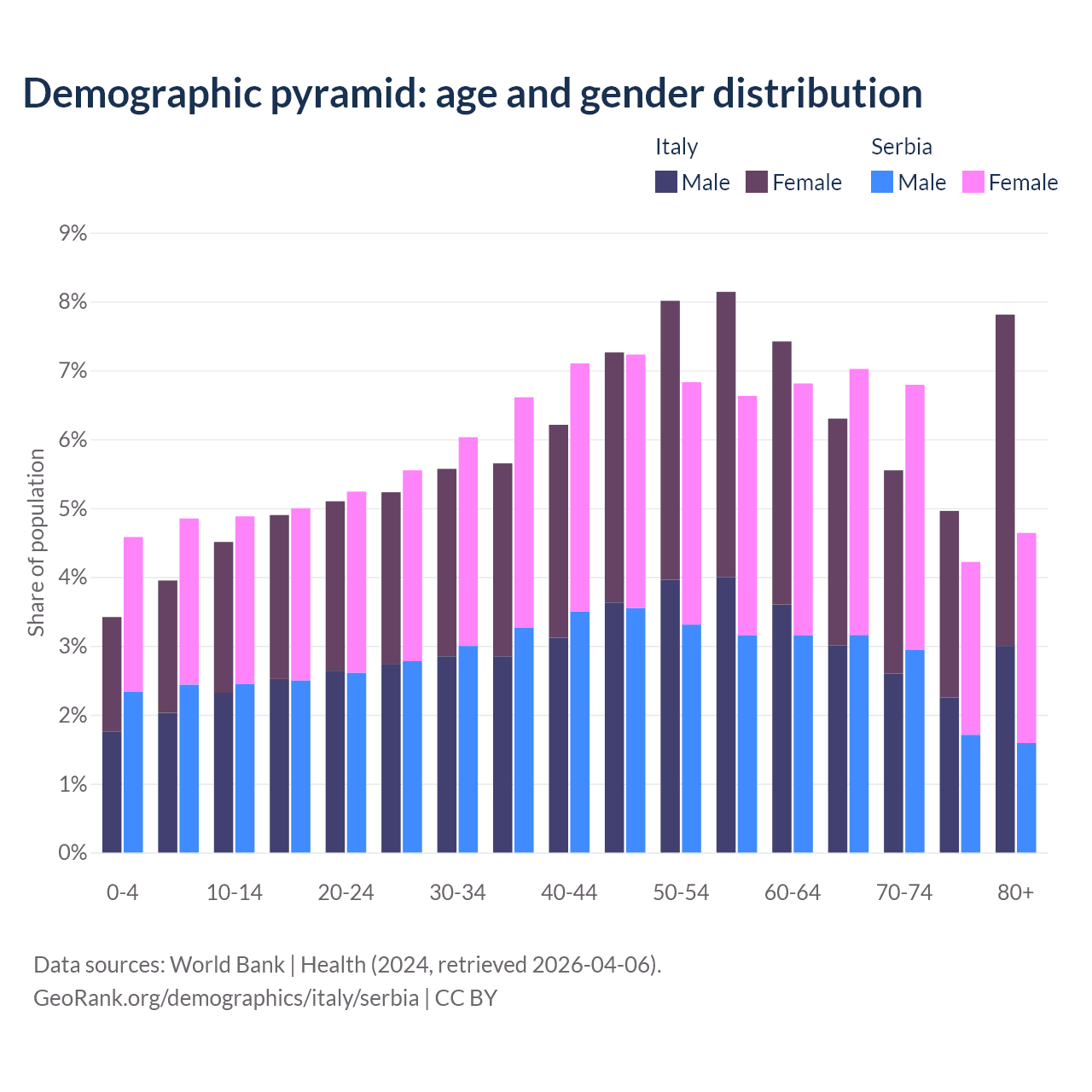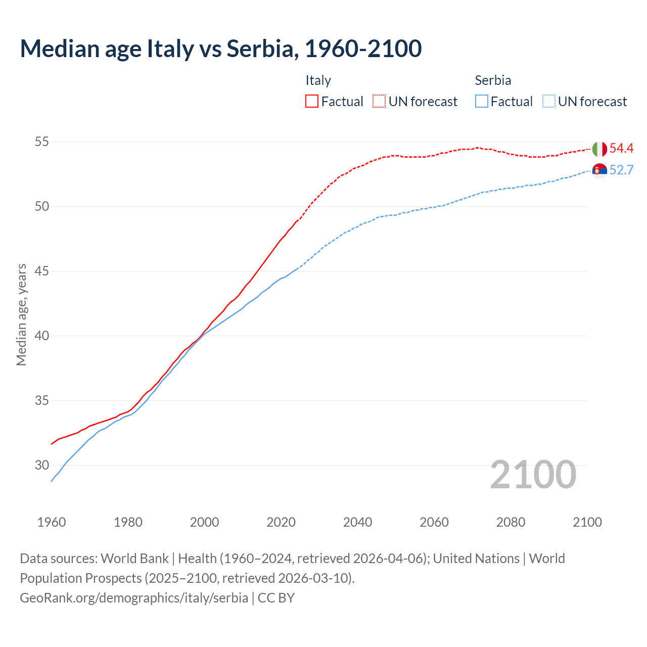 - Italy is ranked 4/196 by median age (oldest to youngest) vs 15/196 for Serbia.