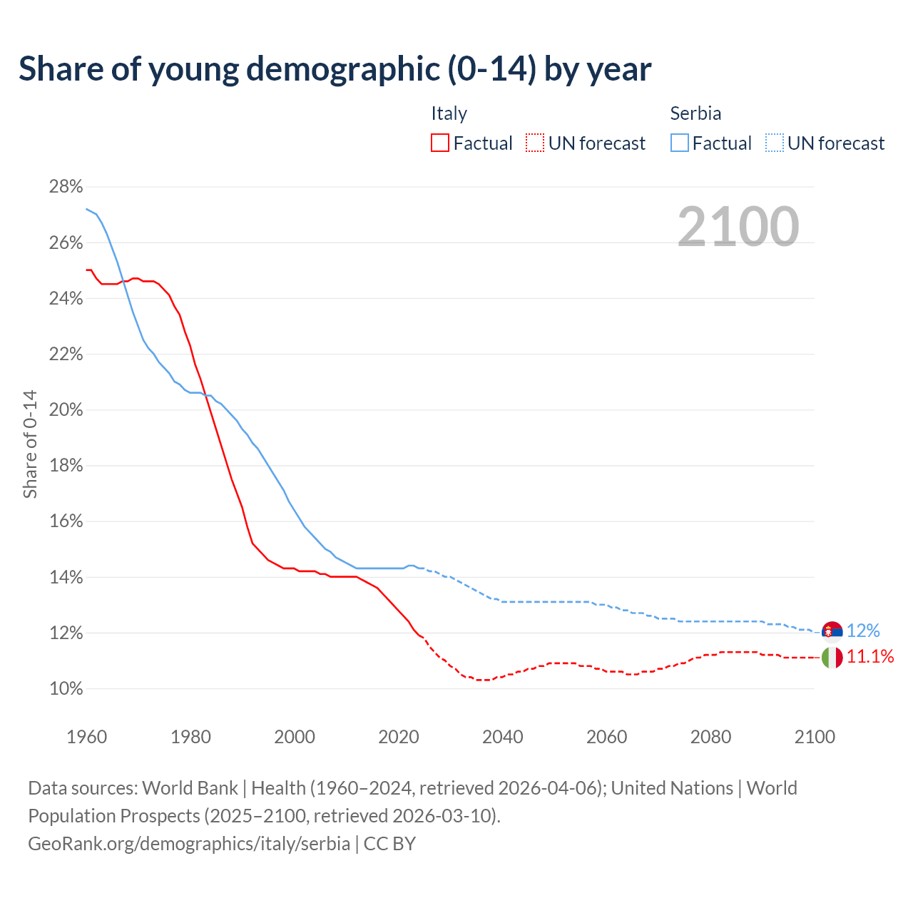 - The share of young demographic (0-15 years old) in Italy is 11.9% vs 14.3% in Serbia.