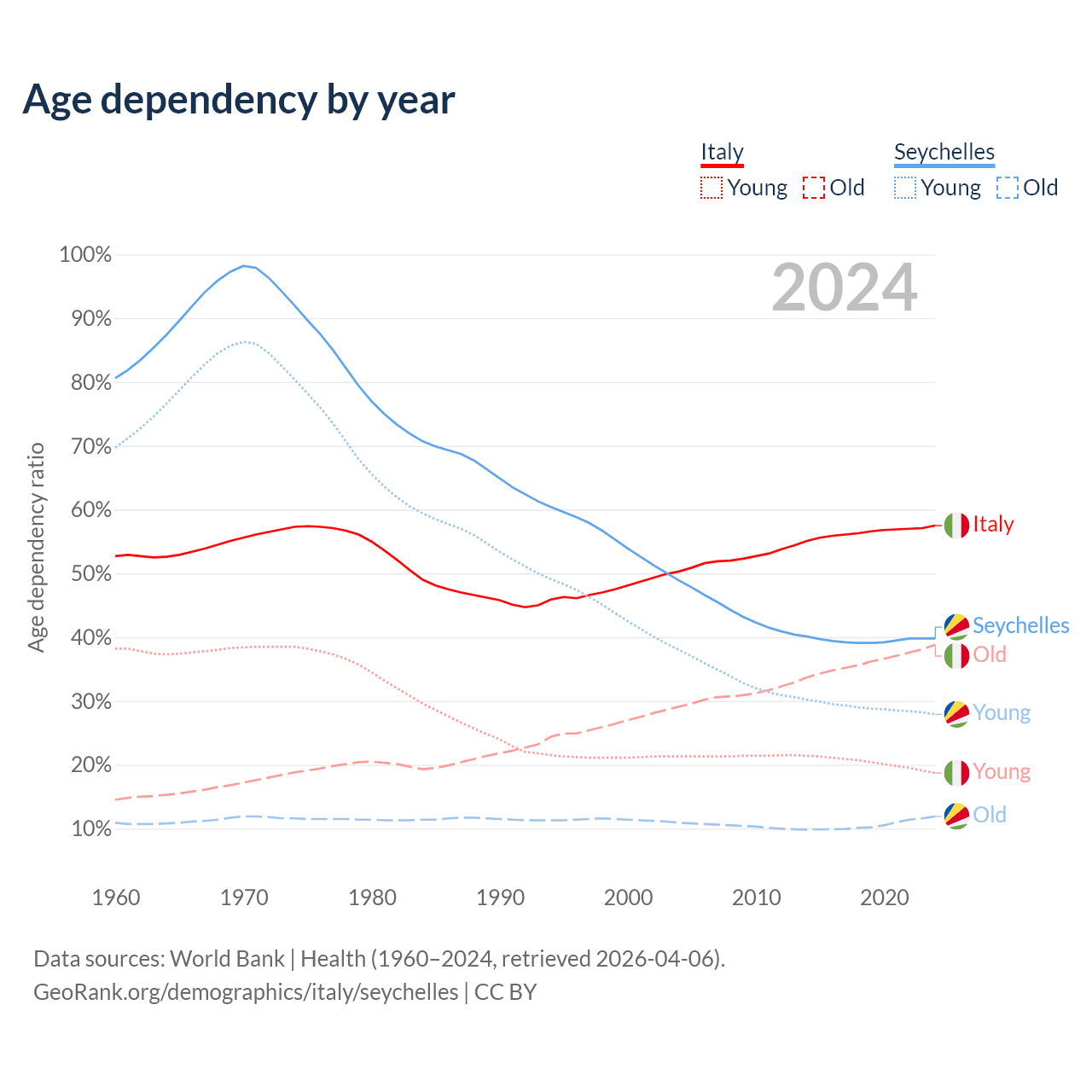 - Italy is ranked 4/196 by median age (oldest to youngest) vs 76/196 for the Seychelles.