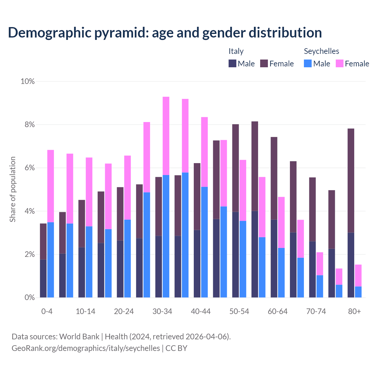 - As of 2026, the population of Italy is 58.6M vs 126K in the Seychelles - 464 times difference.