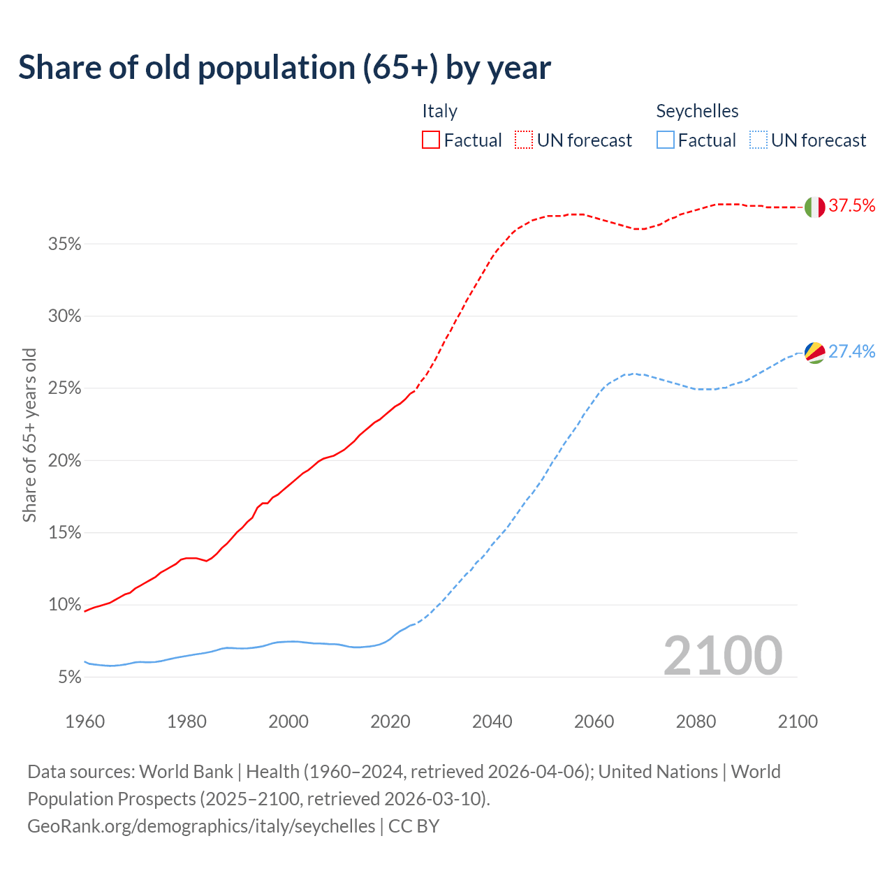 The share of older people aged 65 and over is 24.6% in Italy and 8.54% in the Seychelles. Life expectancy in Italy compared to the Seychelles .