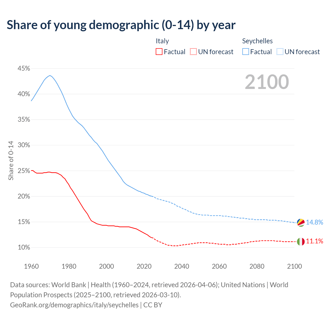 - The share of young demographic (0-15 years old) in Italy is 11.9% vs 20% in the Seychelles.