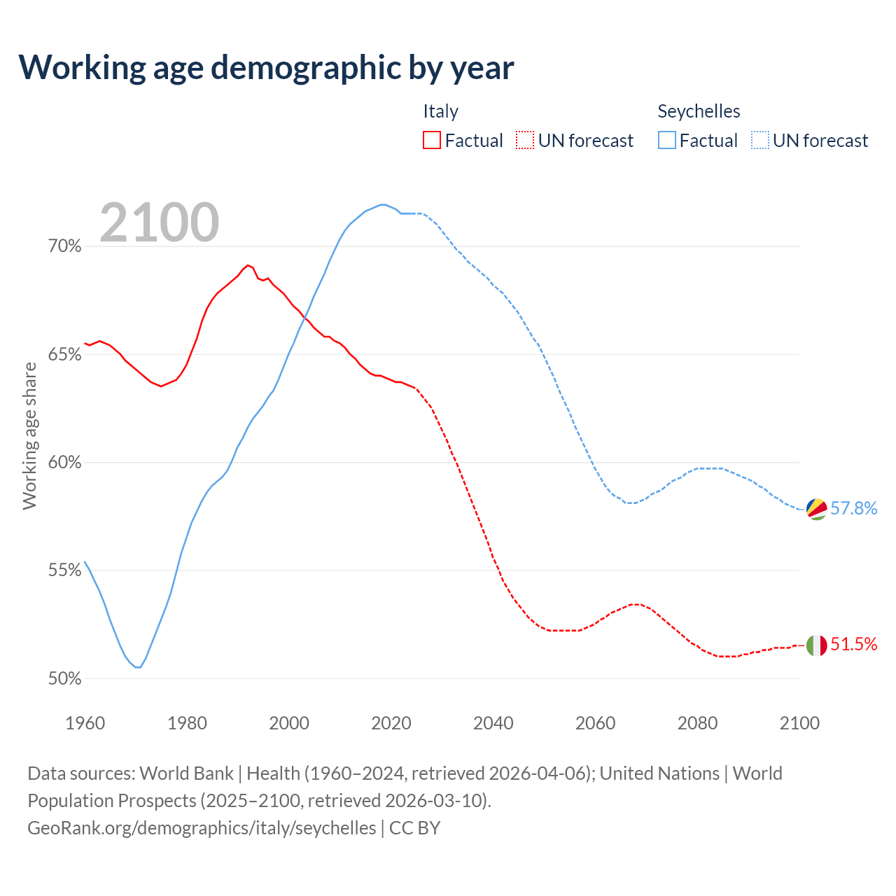 - Italy has 37.2M working age adults (aged 15-64) vs 90.3K in the Seychelles.