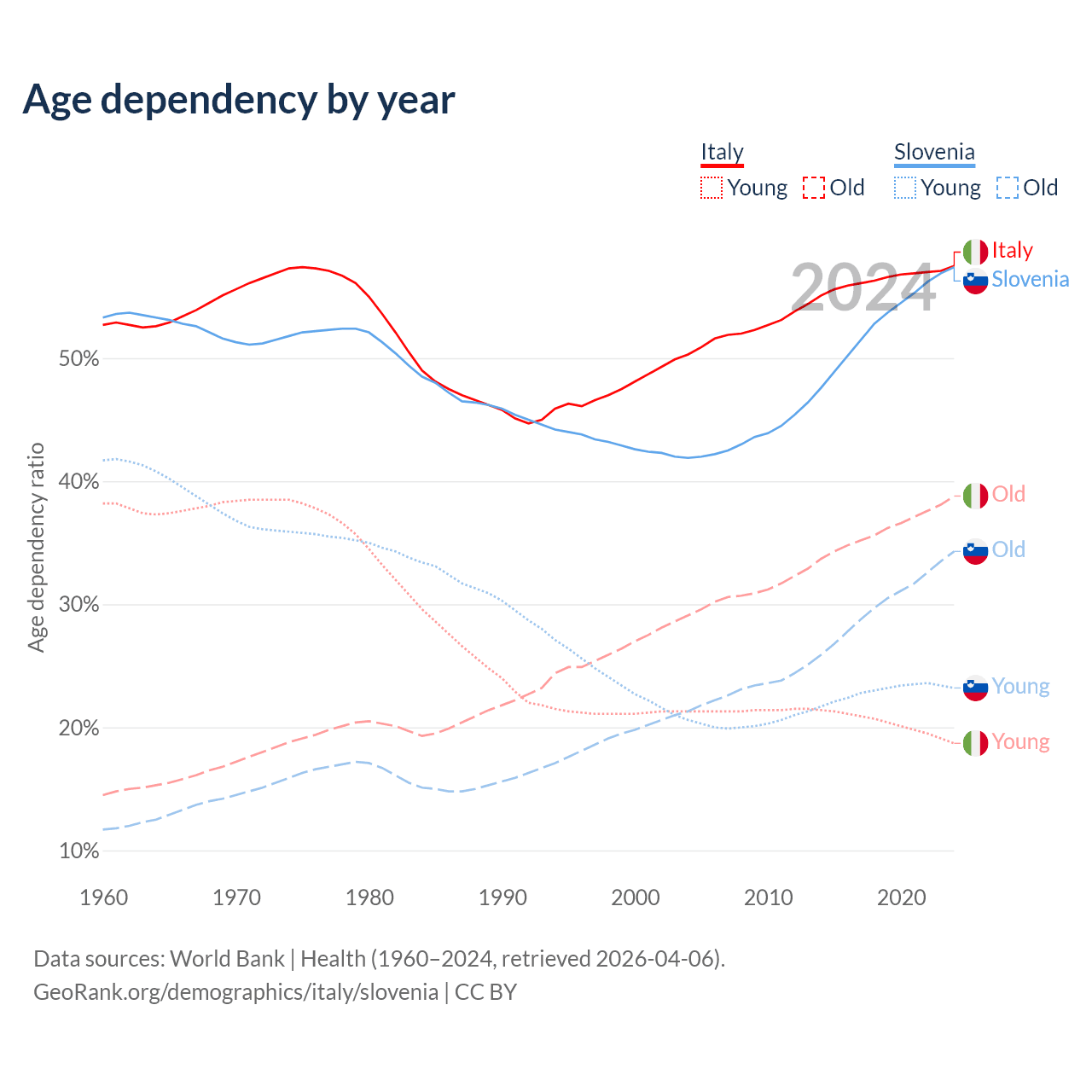 - Italy is ranked 4/196 by median age (oldest to youngest) vs 14/196 for Slovenia.