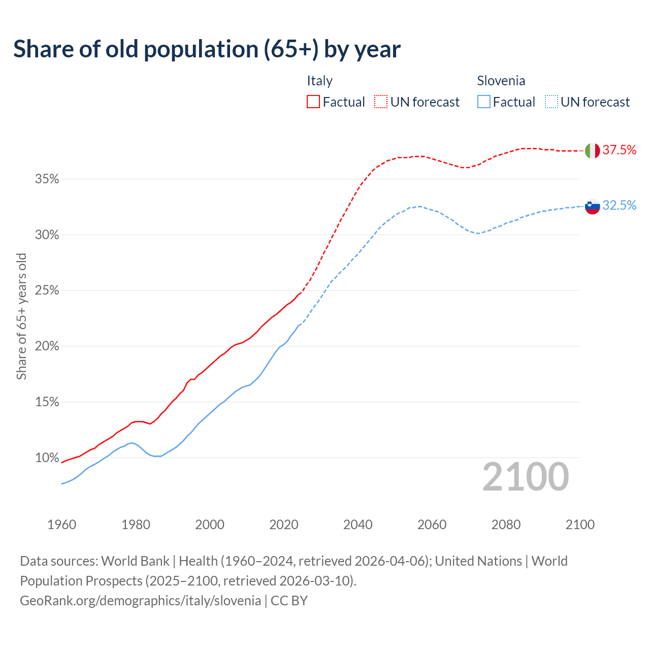 Median age Italy vs Slovenia, 1960-2100