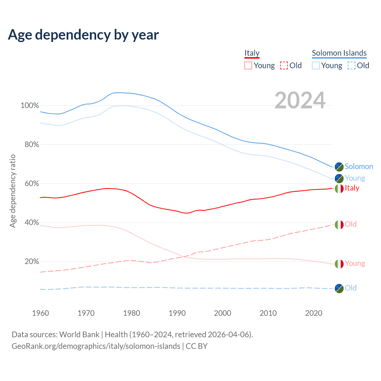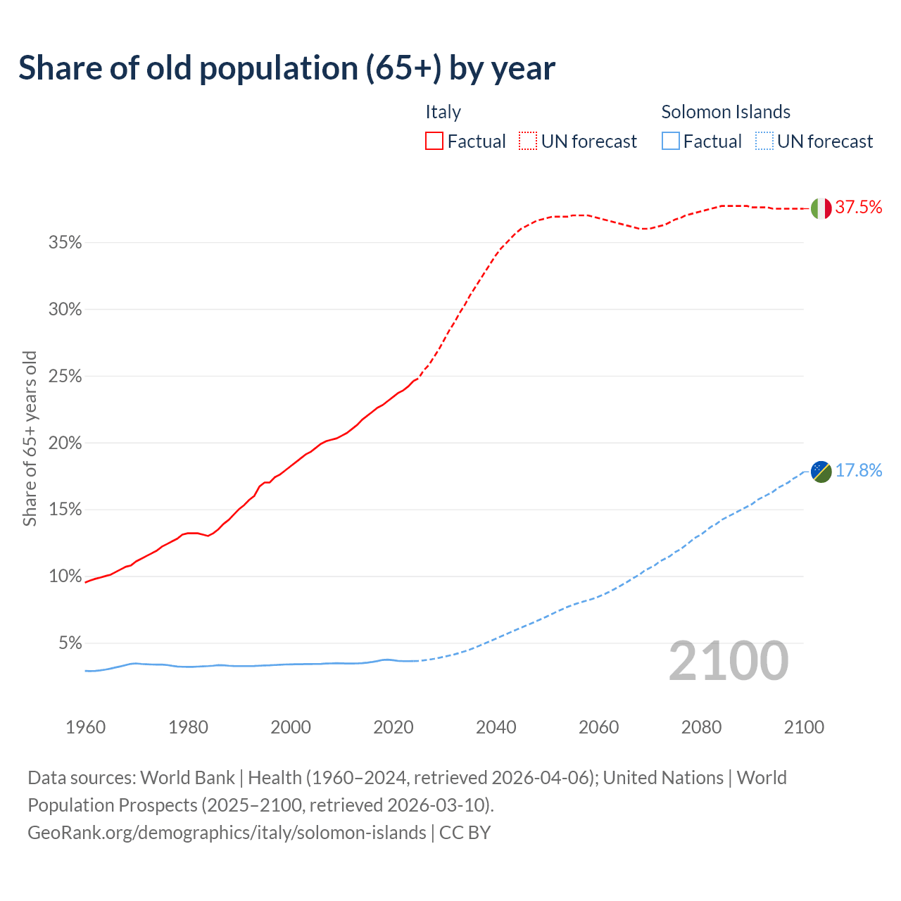 The share of older people aged 65 and over is 24.6% in Italy and 3.64% in the Solomon Islands. Life expectancy in Italy compared to the Solomon Islands .