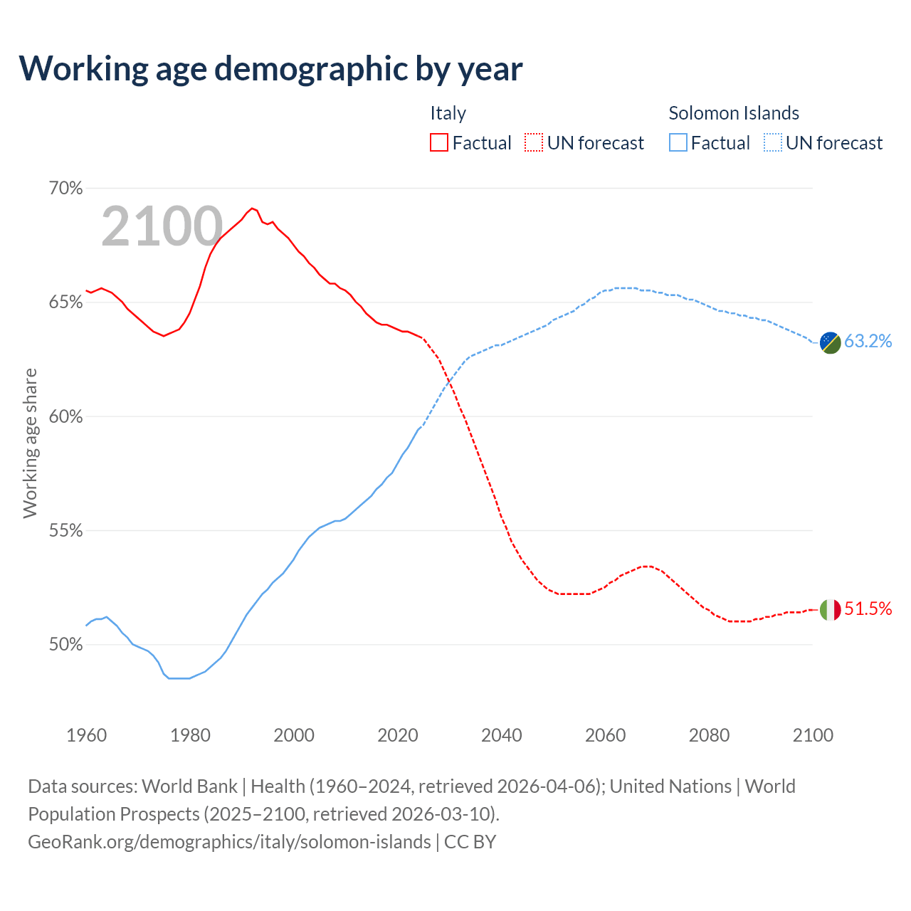 - Italy has 37.2M working age adults (aged 15-64) vs 513K in the Solomon Islands.