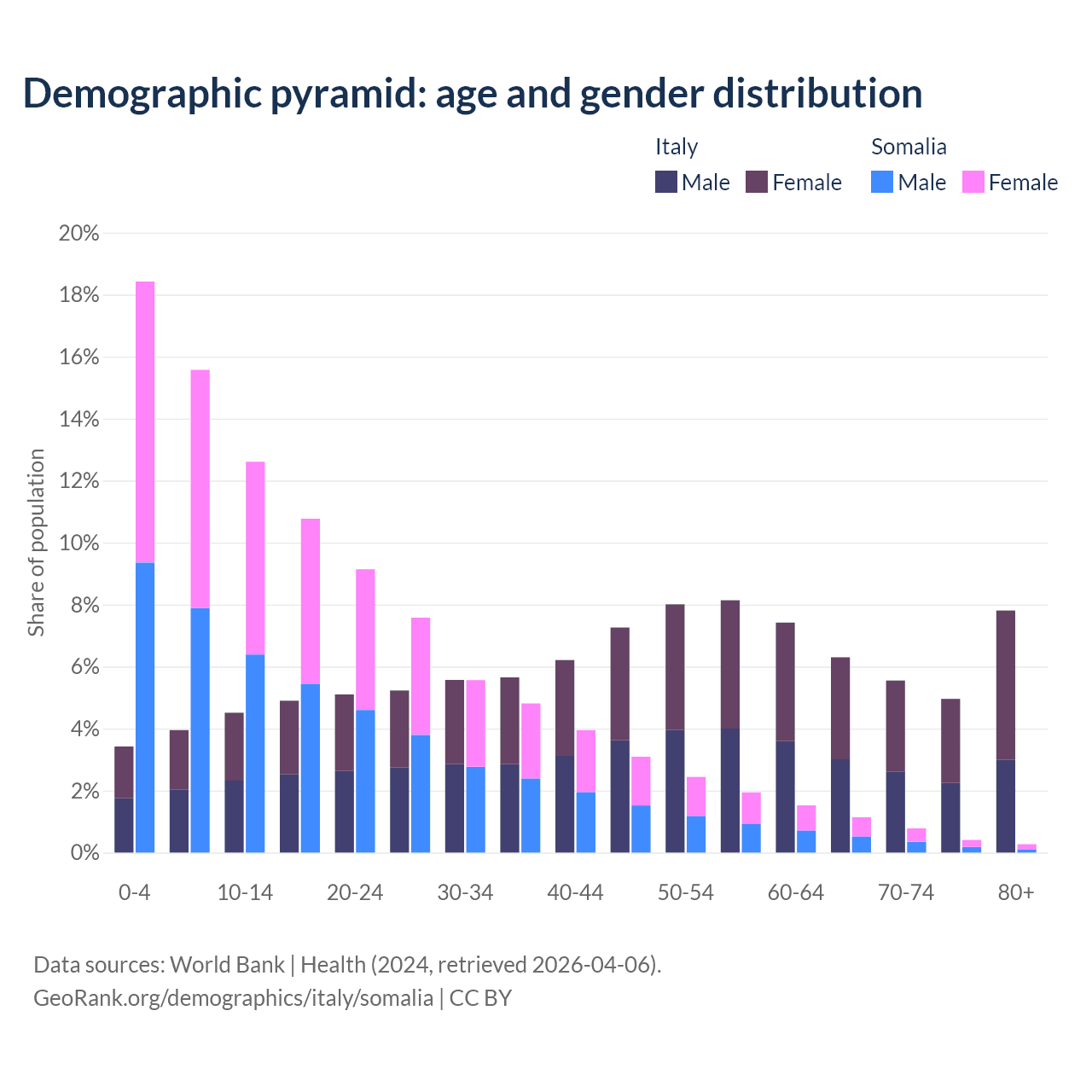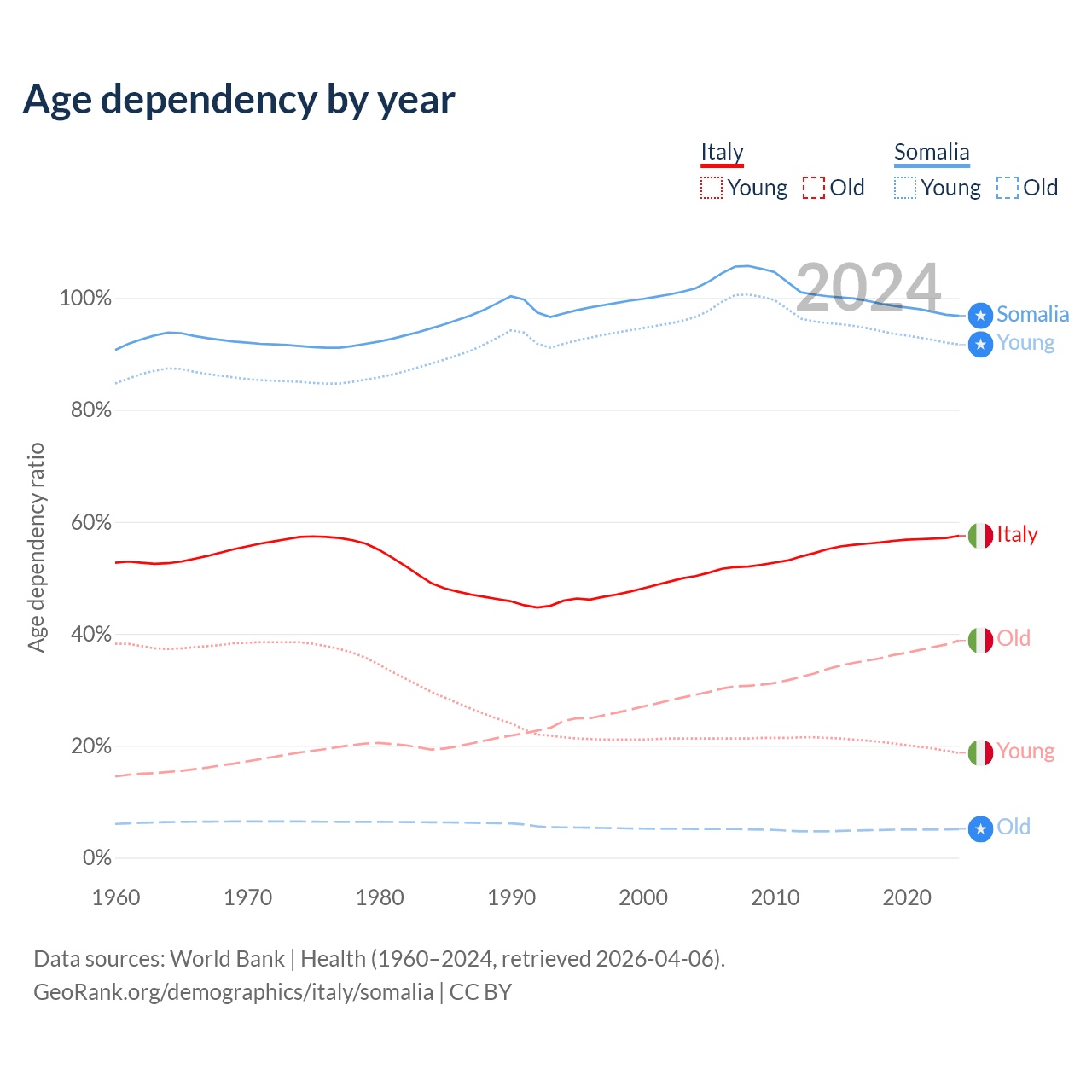 - Italy is ranked 4/196 by median age (oldest to youngest) vs 194/196 for Somalia.